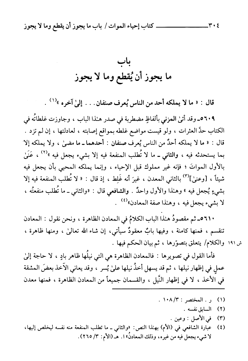 (4) عبارة الشافعي في (الأم) بهذا النص: "والثاني - ما تطلب المنفعة منه نفسه ليخلص إليها، لا شيء يجعل فيه من غيره، وذلك المعادنُ" ا. هـ (الأم: 3/ 265).