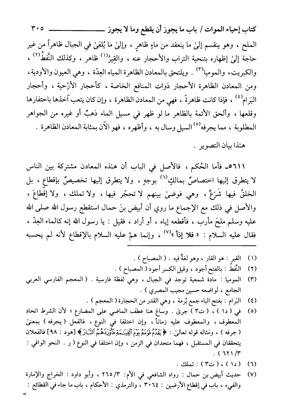 الملح، وهو ينقسم إلى ما ينعقد من ماءٍ ظاهرٍ، وإلى ما يُلفى في الجبال ظاهراً من غير حاجة إلى إظهاره بتنحية التراب والأحجار عنه، والقِيرُ (1) ظاهر، وكذلك النَّفطُ (2)، والكبريت، والموميا (3). ويلتحق بالمعادن الظاهرة المياه العِدّة، وهي العيون والأودية، ومن المعادن الظاهرة الأحجار ذوات المنافع الخاصة، كأحجار الأرْحية، وأحجار البَرام (4)، فإذا كانت ظاهرةً، فهي من المعادن الظاهرة، وإن كان يتعب آخذها باحتفارها وقلعها، وألحق الأئمة بالظاهر ما لو ظهر في مسيل الماء ذهبٌ أو غيره من الجواهر المطلوبة، مما يجرفه (5) السيل وسال به، وأظهره، فهو الآن بمثابة المعادن الظاهرة.