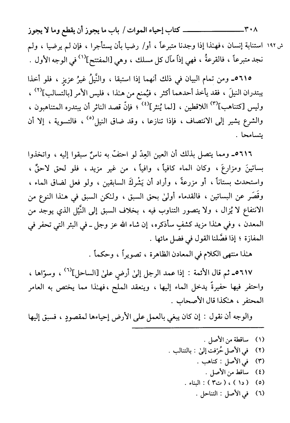 5616 - ومما يتصل بذلك أن العين العِدّ لو احتفّ به ناسٌ سبقوا إليه، واتخذوا بساتينَ ومزارعَ، وكان الماء كافياً، وافياً، من غير مزيد، فلو لحق لاحقٌ، واستحدث بستاناً، أو مزرعةً، وأراد أن يَشْركَ السابقين، ولو فعل لضاق الماء، وقَصَر عن البساتين، فالقدماء أولى بحق السبق، ولكن السبق في هذا النوع من الانتفاع لا يُزال، ولا يتصور التناوب فيه، بخلاف السبق إلى النَّيْل الذي يوجد من المعدن، وفي هذا مزيد كشفٍ سأذكره، إن شاء الله عز وجل- في البئر التي تحفر في المفازة؛ إذا فصَّلنا القول في فضل مائها.