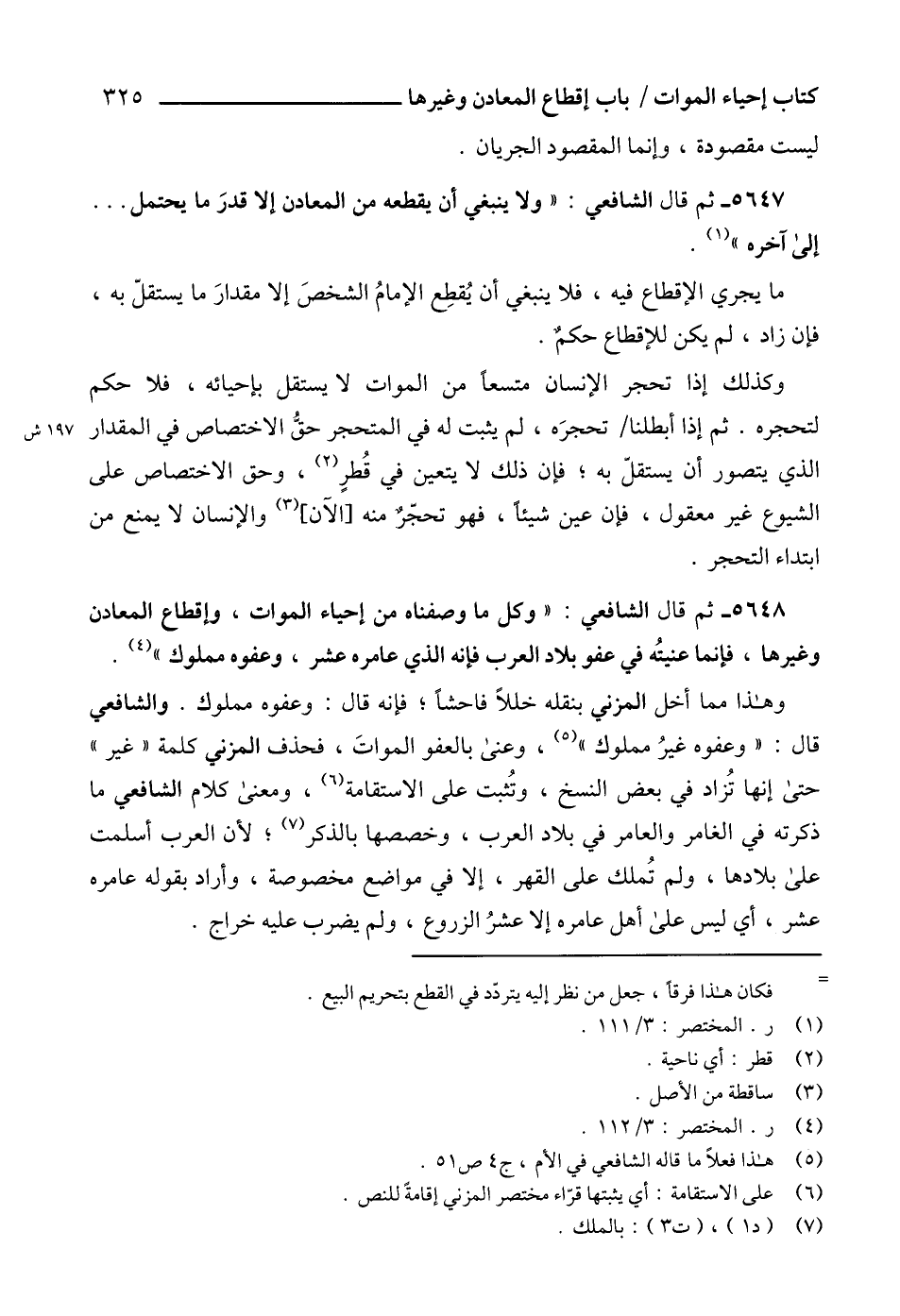 5648 - ثم قال الشافعي: " وكل ما وصفناه من إحياء الموات، وإقطاع المعادن وغيرها، فإنما عنيتُه في عفو بلاد العرب فإنه الذي عامره عشر، وعفوه مملوك " (4).
