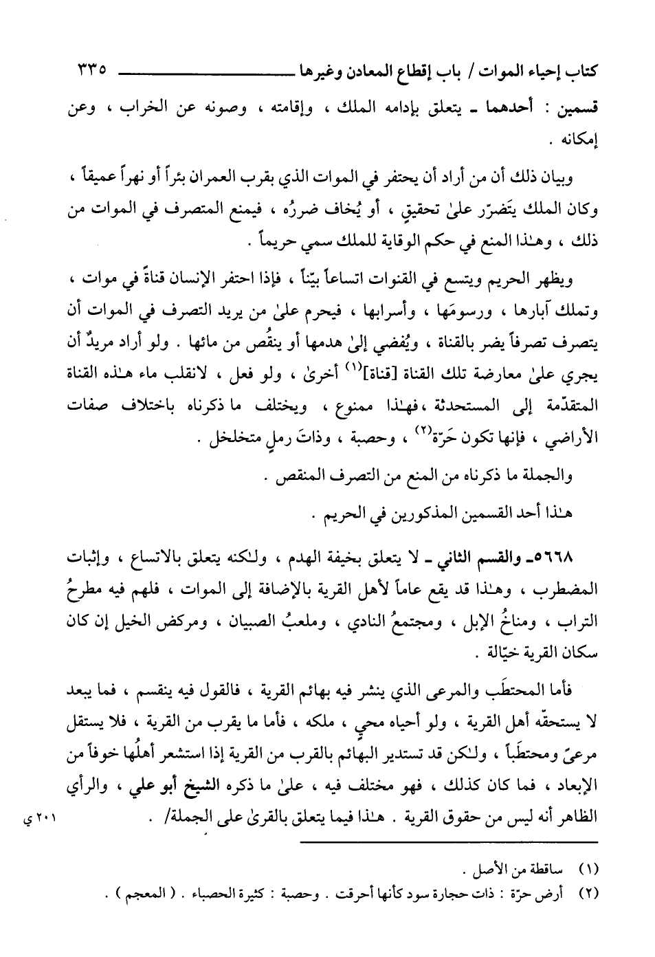 ويظهر الحريم ويتسع في القنوات اتساعاً بيّناً، فإذا احتفر الإنسان قناةً في موات، وتملك آبارها، ورسومَها، وأسرابها، فيحرم على من يريد التصرف في الموات أن يتصرف تصرفاً يضر بالقناة، ويُفضي إلى هدمها أو ينقُص من مائها. ولو أراد مريدٌ أن يجري على معارضة تلك القناة [قناة] (1) أخرى، ولو فعل، لانقلب ماء هذه القناة المتقدّمة إلى المستحدثة، فهذا ممنوع، ويختلف ما ذكرناه باختلاف صفات الأراضي، فإنها تكون حَرّة (2)، وحصبة، وذاتَ رملٍ متخلخل.