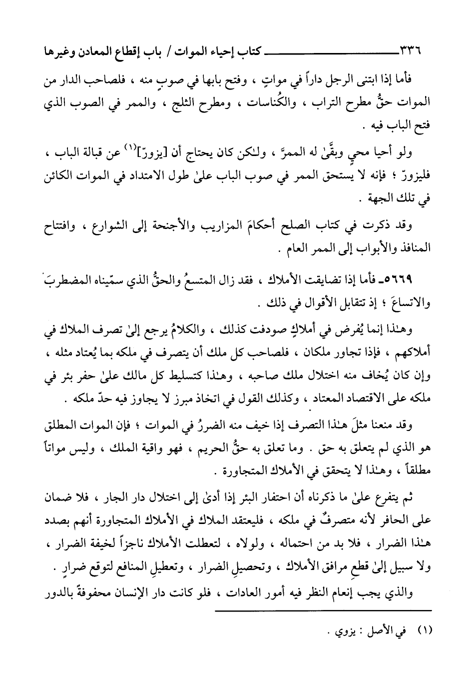 وقد منعنا مثلَ هذا التصرف إذا خيف منه الضررُ في الموات؛ فإن الموات المطلق هو الذي لم يتعلق به حق. وما تعلق به حقُّ الحريم، فهو واقية الملك، وليس مواتاً مطلقاًً، وهذا لا يتحقق في الأملاك المتجاورة.