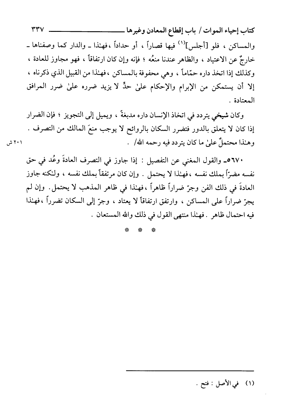 5670 - والقول المغني عن التفصيل: إذا جاوز في التصرف العادةَ وعُد في حق نفسه مضرّاً بملك نفسه، فهذا لا يحتمل. وإن كان مرتفقاً بملك نفسه، ولكنه جاوز العادةَ في ذلك الفن وجرّ ضراراً ظاهراً، فهذا في ظاهر المذهب لا يحتمل. وإن لم يجرّ ضراراً على المساكن، وارتفق ارتفاقاً لا يعتاد، وجرّ إلى السكان تضرراً، فهذا فيه احتمال ظاهر. فهذا منتهى القول في ذلك والله المستعان.