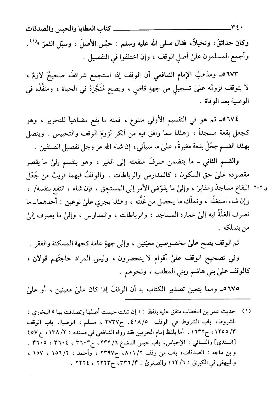 (1) حديث عمر بن الخطاب متفق عليه بلفظ: " إن شئت حبست أصلها وتصدقت بها " البخاري: الشروط، باب الشروط في الوقف 5/ 418، ح 2737، مسلم: الوصية، باب الوقف 3/ 1255، ح 1632. أما بلفظ إمام الحرمين فقد رواه الشافعي في مسنده: 2/ 138، ح 457 [السندي] والنسائي: الإحباس، باب حبس المشاع 6/ 232، ح 3603، 3604، 3605. وابن ماجه: الصدقات، باب من وقف 2/ 801، ح 2397، وأحمد: 2/ 156، 157، والبيهقي في الكبرى: 6/ 162 والصغرى: 3/ 336، ح 2223، 2224.