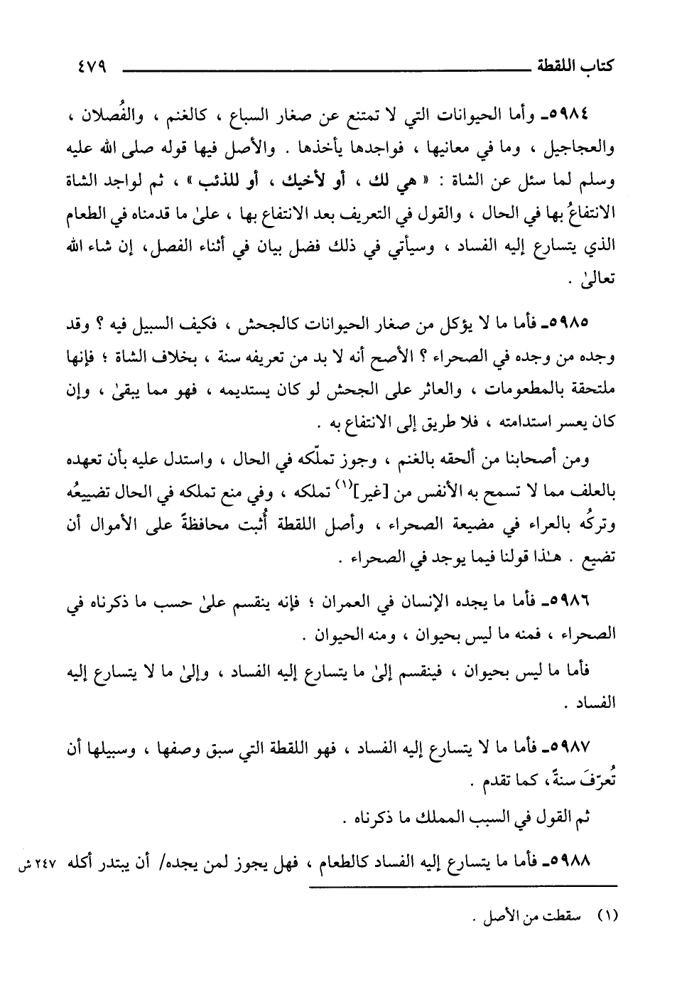 5987 - فأما ما لا يتسارع إليه الفساد، فهو اللقطة التي سبق وصفها، وسبيلها أن تُعرّفَ سنةً، كما تقدم.
