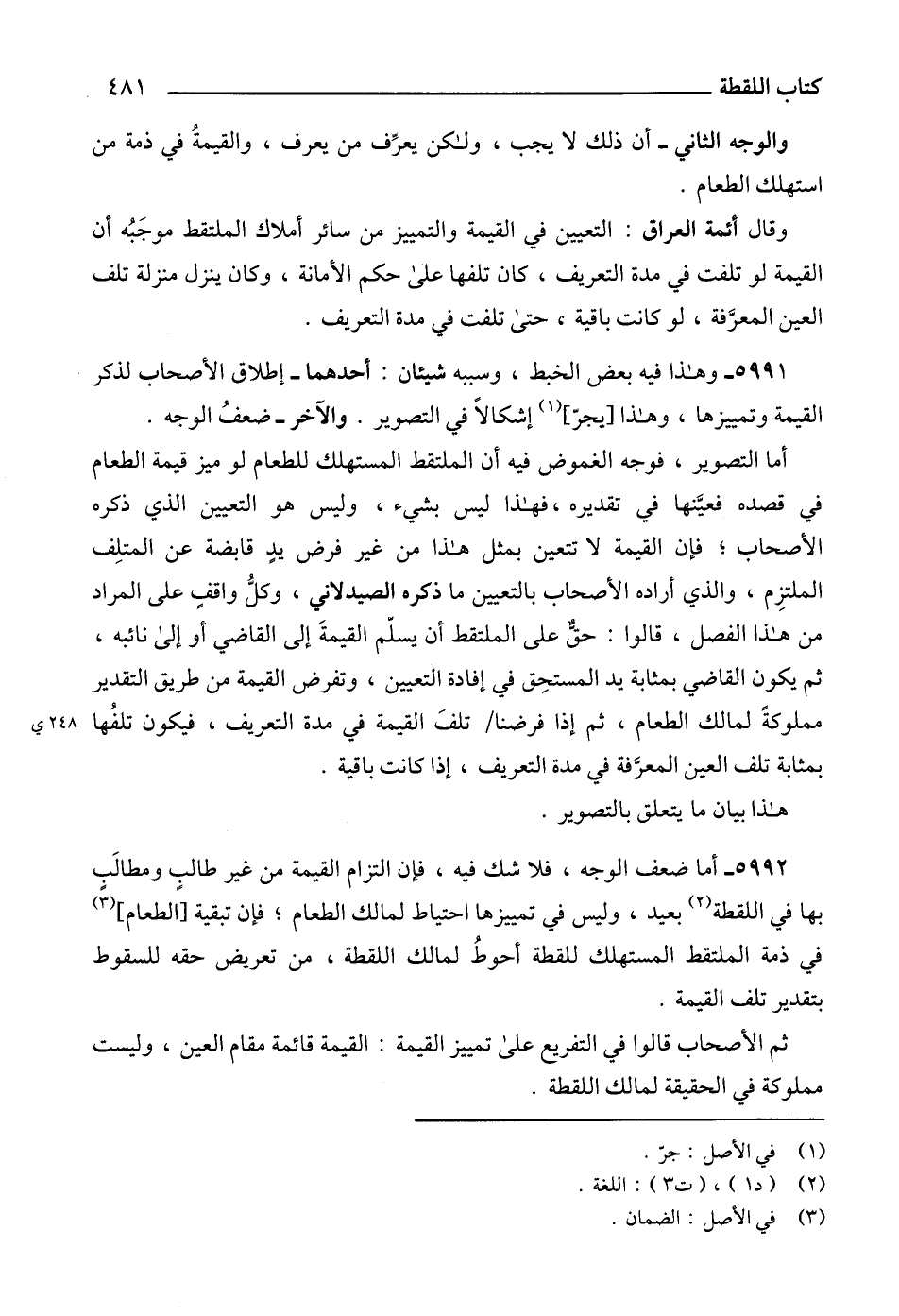 5992 - أما ضعف الوجه، فلا شك فيه، فإن التزام القيمة من غير طالبٍ ومطالَبٍ بها في اللقطة (2) بعيد، وليس في تمييزها احتياط لمالك الطعام؛ فإن تبقية [الطعام] (3) في ذمة الملتقط المستهلك للقطة أحوطُ لمالك اللقطة، من تعريض حقه للسقوط بتقدير تلف القيمة.