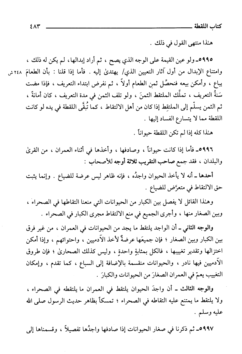 5996 - فأما إذا كانت حيواناً، وصادفها، وأخذها في أثناء العمران، من القرى والبلدان، فقد جمع صاحب التقريب ثلاثة أوجه للأصحاب: