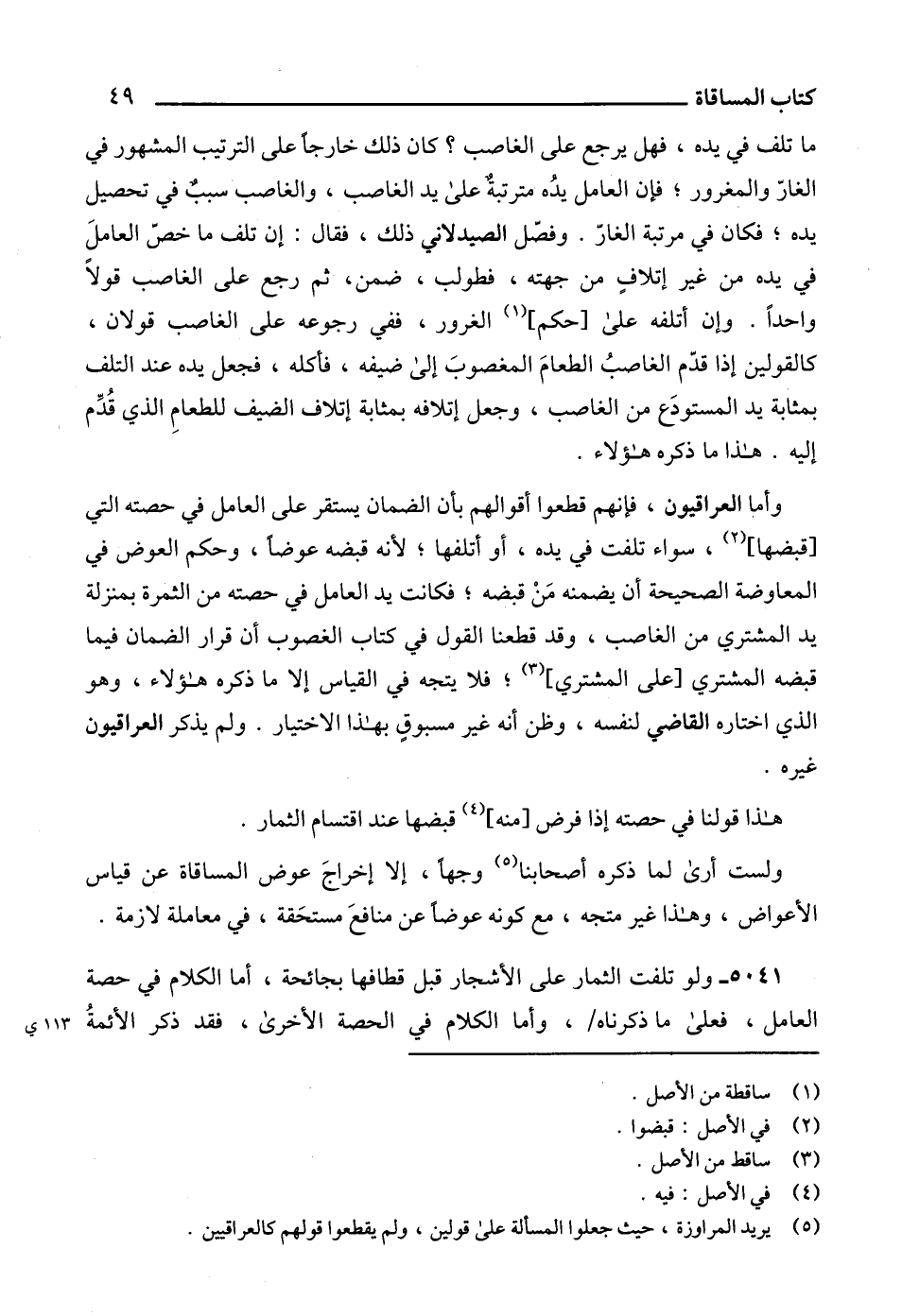 وأما العراقيون، فإنهم قطعوا أقوالهم بأن الضمان يستقر على العامل في حصته التي [قبضها] (2)، سواء تلفت في يده، أو أتلفها؛ لأنه قبضه عوضاً، وحكم العوض في المعاوضة الصحيحة أن يضمنه مَنْ قبضه؛ فكانت يد العامل في حصته من الثمرة بمنزلة يد المشتري من الغاصب، وقد قطعنا القول في كتاب الغصوب أن قرار الضمان فيما قبضه المشتري [على المشتري] (3)؛ فلا يتجه في القياس إلا ما ذكره هؤلاء، وهو الذي اختاره القاضي لنفسه، وظن أنه غير مسبوقٍ بهذا الاختيار. ولم يذكر العراقيون غيره.