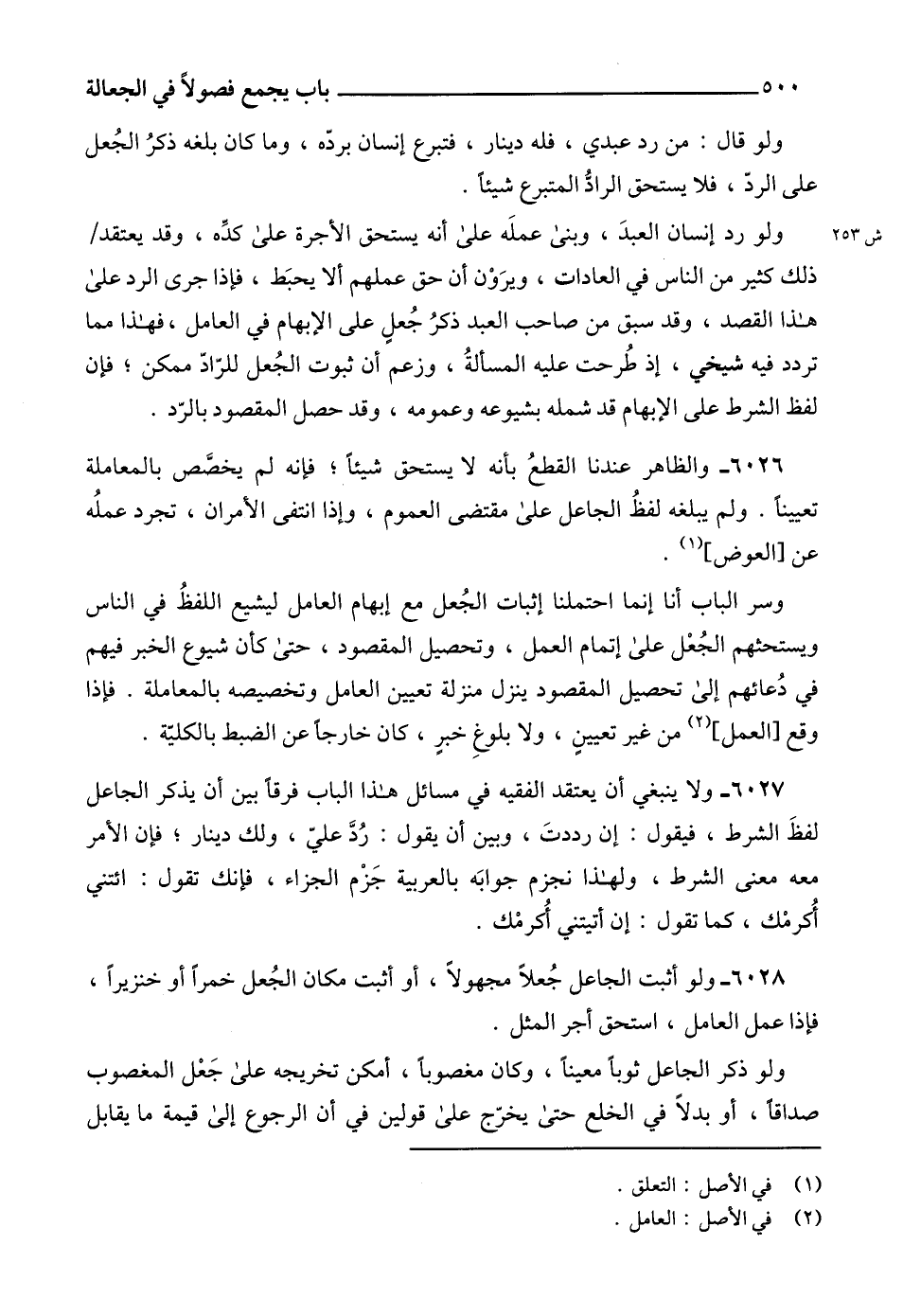 6027 - ولا ينبغي أن يعتقد الفقيه في مسائل هذا الباب فرقاً بين أن يذكر الجاعل لفظَ الشرط، فيقول: إن رددتَ، وبين أن يقول: رُدَّ عليّ، ولك دينار؛ فإن الأمر معه معنى الشرط، ولهذا نجزم جوابَه بالعربية جَزْم الجزاء، فنك تقول: ائتني أُكُرمْك، كما تقول: إن أتيتني أكُرمْك.