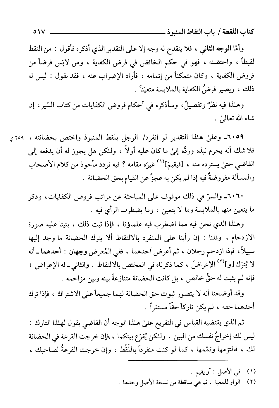 وأمّا الوجه الثاني، فلا ينقدح له وجه إلا على التقدير الذي أذكره فأقول: من التقط لقيطاً، واحتضنه، فهو في حكم الخائض في فرض الكفاية، ومن لابَس فرضاً من فروض الكفاية، وكان متمكناً من إتمامه، فأراد الإضراب عنه، فقد نقول: ليس له ذلك، ويصير فرضُ الكفاية بالملابسة متعيّناً.