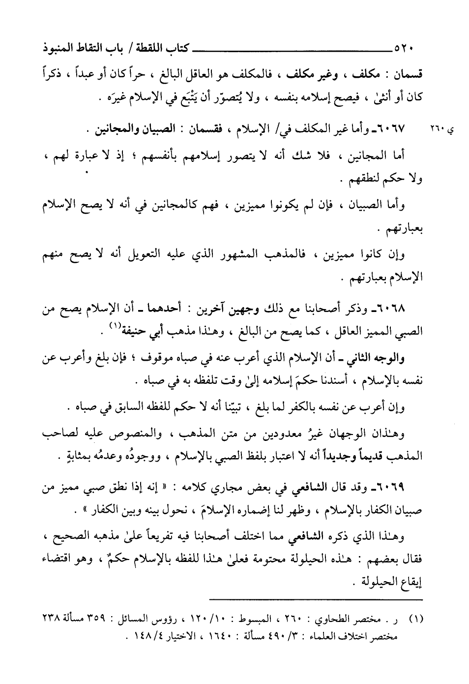 6067 - وأما غير المكلف في الإسلام، فقسمان: الصبيان والمجانين.