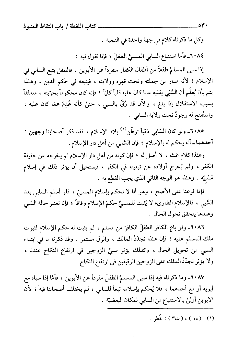 6085 - ولو كان السّابي ذمّياً توطّن (1) بلاد الإسلام، فقد ذكر أصحابنا وجهين: أحدهما - أنه يحكم له بالإسلام؛ فإن السَّابي من أهل دار الإسلام.