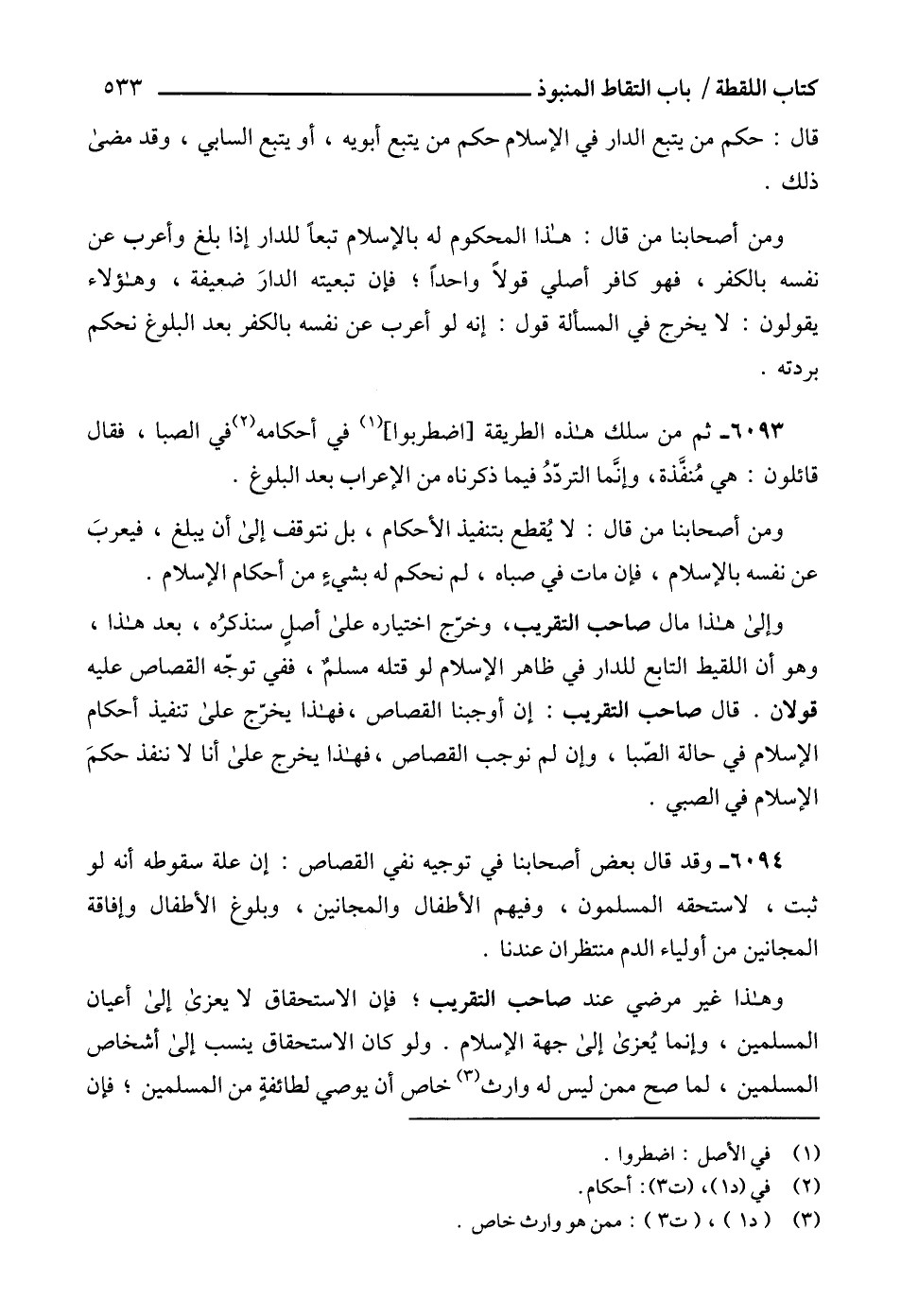 وإلى هذا مال صاحب التقريب، وخرّج اختياره على أصلٍ سنذكرُه، بعد هذا، وهو أن اللقيط التابع للدار في ظاهر الإسلام لو قتله مسلمٌ، ففي توجّه القصاص عليه قولان. قال صاحب التقربب: إن أوجبنا القصاص، فهذا يخرّج على تنفيد أحكام الإسلام في حالة الصّبا، وإن لم نوجب القصاص، فهذا يخرج على أنا لا ننفد حكمَ الإسلام في الصبي.