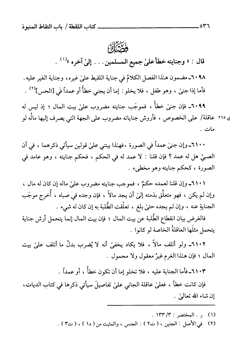 6098 - مضمون هذا الفصل الكلامُ في جناية اللقيط على غيره، وجناية الغير عليه.