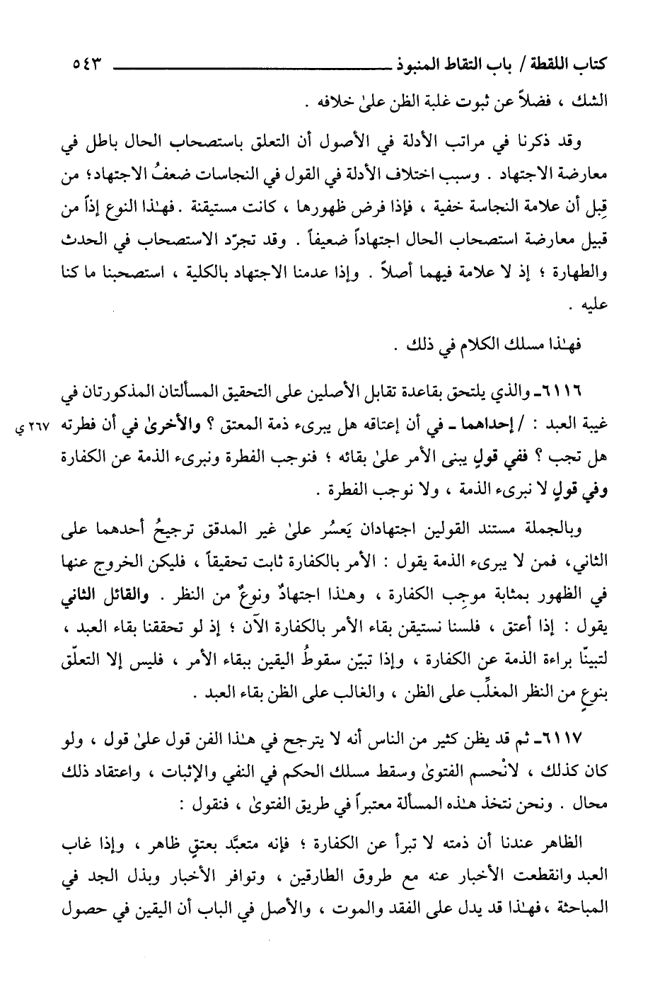 6116 - والذي يلتحق بقاعدة تقابل الأصلين على التحقيق المسألتان المذكورتان في غيبة العبد: إحداهما - في أن إعتاقه هل يبرىء ذمة المعتق؟ والأخرى في أن فطرته هل تجب؟ ففي قولٍ يبنى الأمر على بقائه؛ فنوجب الفطرة ونبرىء الذمة عن الكفارة وفي قولٍ لا نبرىء الذمة، ولا نوجب الفطرة.