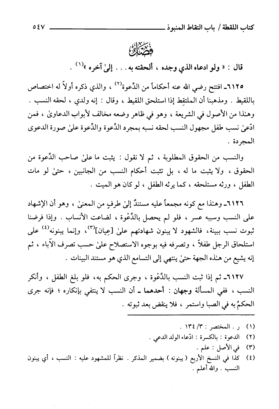 6125 - افتتح رضي الله عنه أحكاماً من الدّعوة (2)، والذي ذكره أولاً له اختصاص باللقيط. ومذهبنا أن الملتقِط إذا استلحق اللقيط، وقال: إنه ولدي، لحقه النسب.