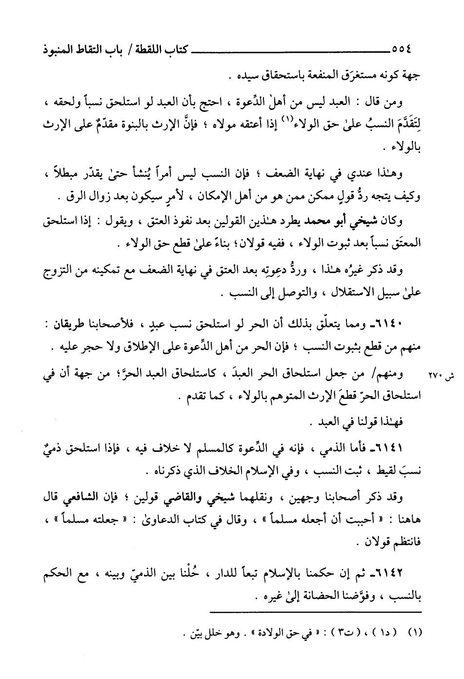 6140 - ومما يتعلّق بذلك أن الحر لو استلحق نسب عبدٍ، فلأصحابنا طريقان: منهم من قطع بثبوت النسب؛ فإن الحر من أهل الدِّعوة على الإطلاق ولا حجر عليه.