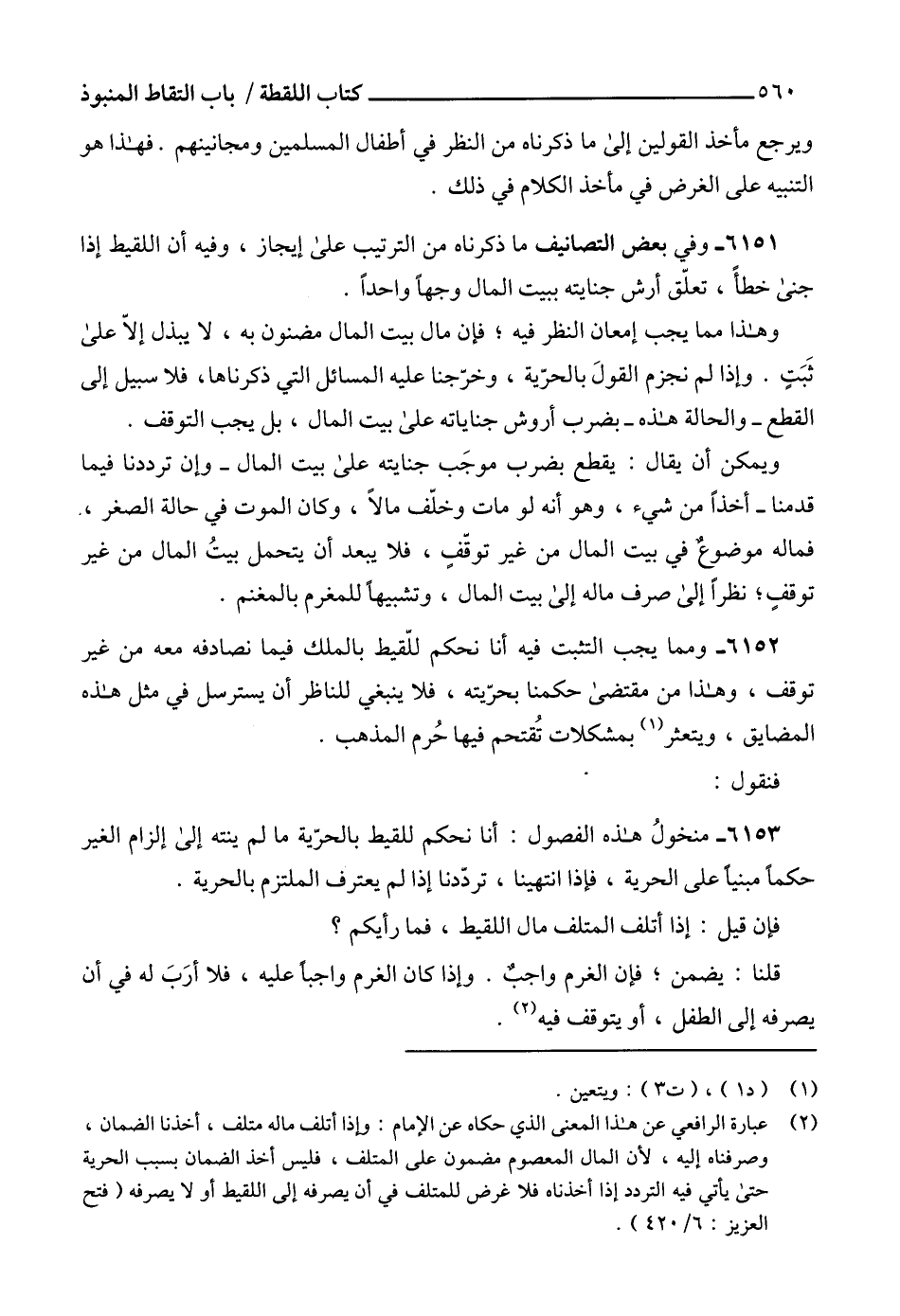 6153 - منخولُ هذه الفصول: أنا نحكم للقيط بالحرّية ما لم ينته إلى إلزام الغير حكماً مبنياً على الحرية، فإذا انتهينا، تردّدنا إذا لم يعترف الملتزم بالحرية.