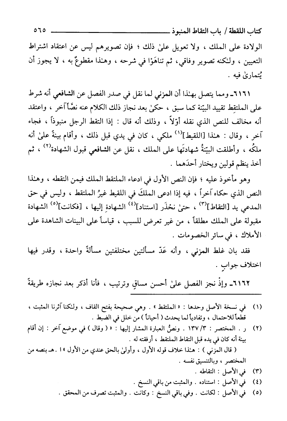 6161 - ومما يتصل بهذا أن المزني لما نقل في صدر الفصل عن الشافعي أنه شرط على الملتقِط تقييد البيّنة كما سبق، حكى بعد نجاز ذلك الكلام عنه نصَّاً آخر، واعتقد أنه مخالف للنص الذي نقله أوّلاً، وذلك أنه قال: إذا التقط الرجل منبوذاً، فجاء آخر، وقال: هذا [اللقيط] (1) ملكي، كان في يدي قبل ذلك، وأقام بينةً على أنه ملكُه، وأطلقت البيّنةُ شهادتَها على الملك، نقل عن الشافعي قبول الشهادة (2)، ثم أخذ ينظم قولين ويختار أحدَهما.