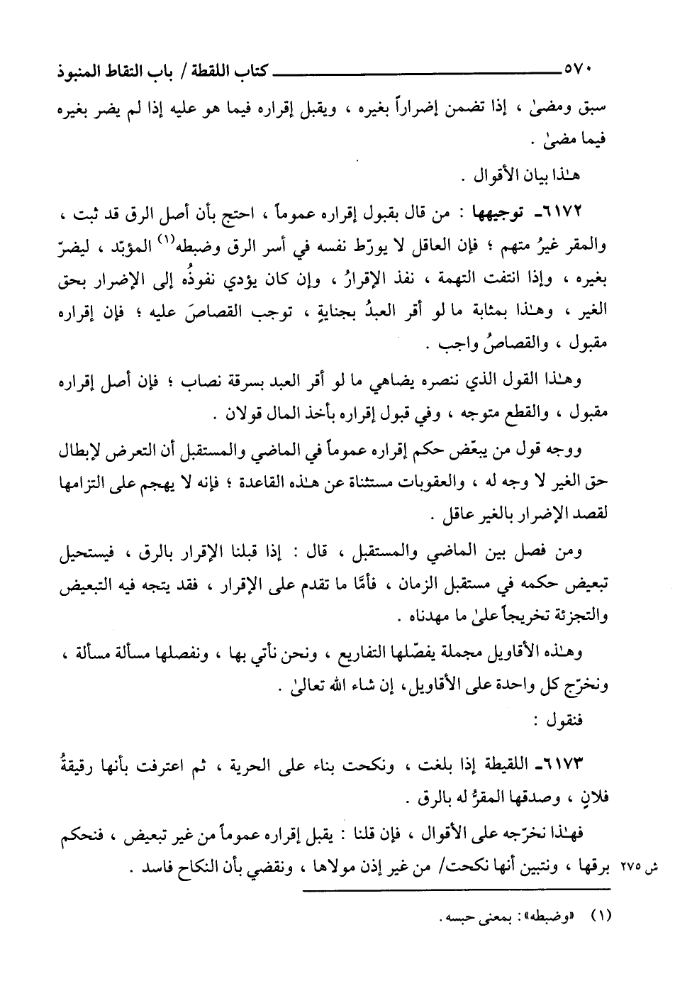 6172 - توجيهها: من قال بقبول إقراره عموماً، احتج بأن أصل الرق قد ثبت، والمقر غيرُ متهم؛ فإن العاقل لا يورّط نفسه في أسر الرق وضبطه (1) المؤبّد، ليضرّ بغيره، وإذا انتفت التهمة، نفد الإقرارُ، وإن كان يؤدي نفوذُه إلى الإضرار بحق الغير، وهذا بمثابة ما لو أقر العبدُ بجنايةٍ، توجب القصاصَ عليه؛ فإن إقراره مقبول، والقصاصُ واجب.