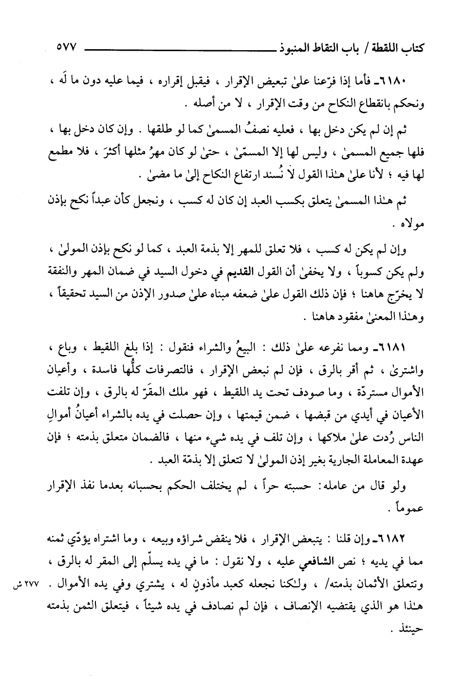 6182 - وإن قلنا: يتبعض الإقرار، فلا ينقض شراؤه وبيعه، وما اشتراه يؤدّي ثمنه مما في يديه؛ نص الشافعي عليه، ولا نقول: ما في يده يسلّم إلى المقر له بالرق، وتتعلق الأثمان بذمته، ولكنا نجعله كعبد مأذونٍ له، يشتري وفي يده الأموال هذا هو الذي يقتضيه الإنصاف، فإن لم نصادف في يده شيئاً، فيتعلق الثمن بذمته حينئذ.