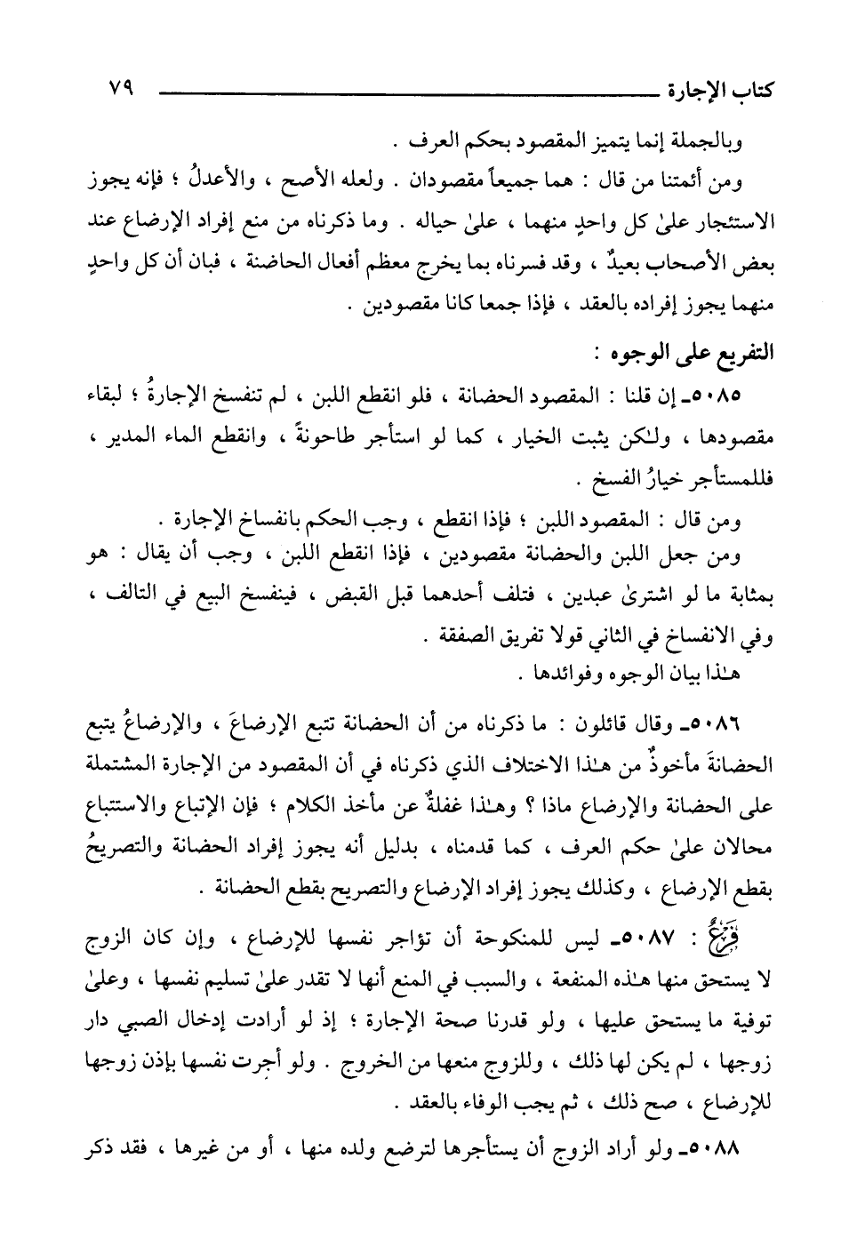 5086 - وقال قائلون: ما ذكرناه من أن الحضانة تتبع الإرضاعَ، والإرضاعُ يتبع الحضانةَ مأخوذٌ من هذا الاختلاف الذي ذكرناه في أن المقصود من الإجارة المشتملة على الحضانة والإرضاع ماذا؟ وهذا غفلةٌ عن مأخذ الكلام؛ فإن الإتباع والاستتباع محالان على حكم العرف، كما قدمناه، بدليل أنه يجوز إفراد الحضانة والتصريحُ بقطع الإرضاع، وكذلك يجوز إفراد الإرضاع والتصريح بقطع الحضانة.