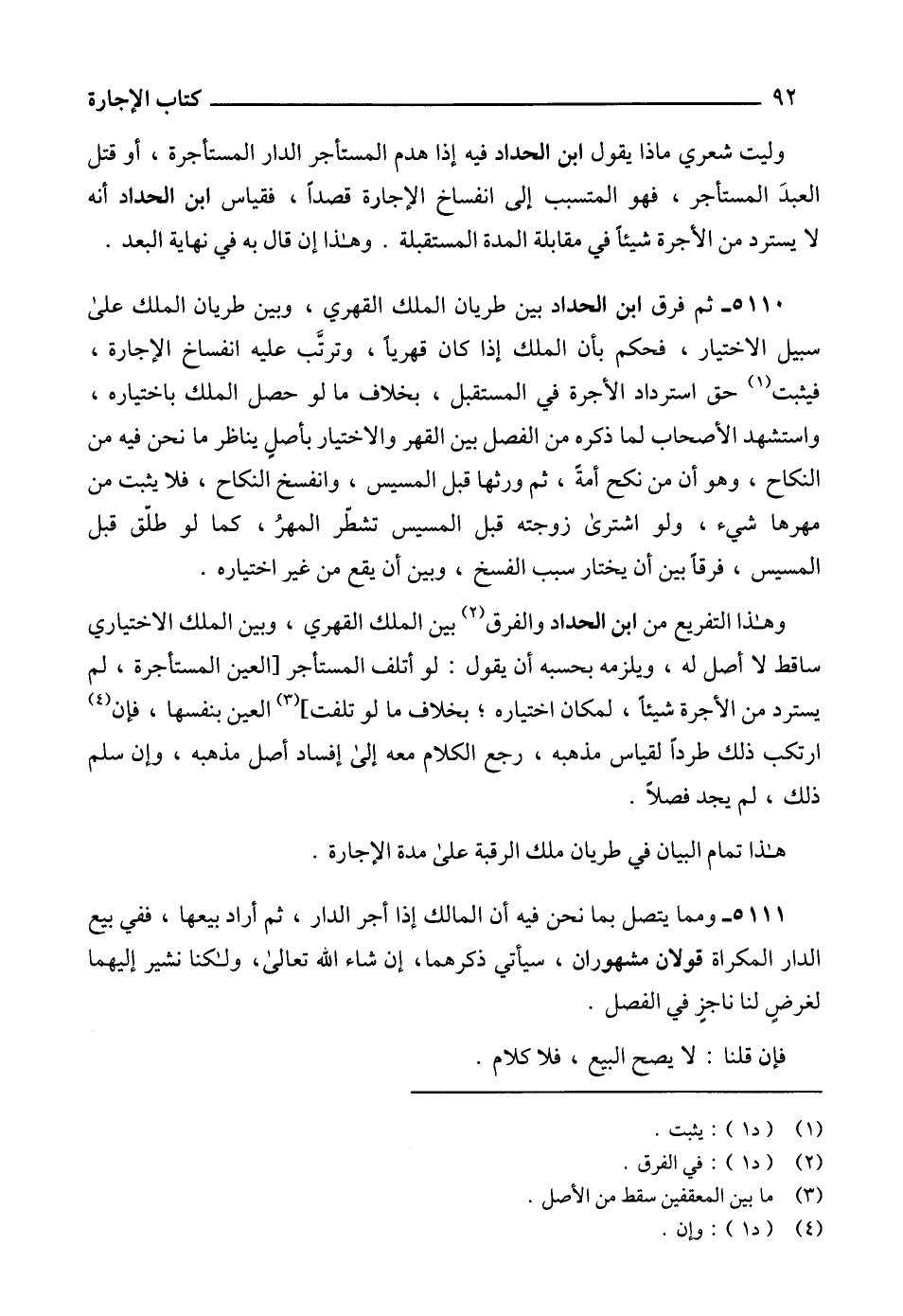 وليت شعري ماذا يقول ابن الحداد فيه إذا هدم المستأجر الدار المستأجرة، أو قتل العبدَ المستأجر، فهو المتسبب إلى انفساخ الإجارة قصداً، فقياس ابن الحداد أنه لا يسترد من الأجرة شيئاًً في مقابلة المدة المستقبلة. وهذا إن قال به في نهاية البعد.