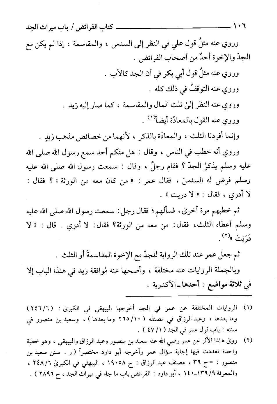 (1) الروايات المختلفة عن عمر في الجد أخرجها البيهقي في الكبرى: (6/ 246) وما بعدها، وعبد الرزاق في مصنفه (10/ 265 وما بعدها)، وسعيد بن منصور في سننه: باب قول عمر في الجد (1/ 47).
