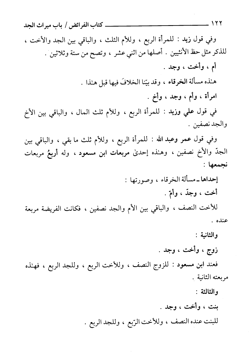 وفي قول عمر وعبد الله: للمرأة الربع، وللأم ثلث ما بقي، والباقي بين الجدّ والأخ نصفين، وهذه إحدى مربعات ابن مسعود، وله أربعُ مربعات نجمعها: