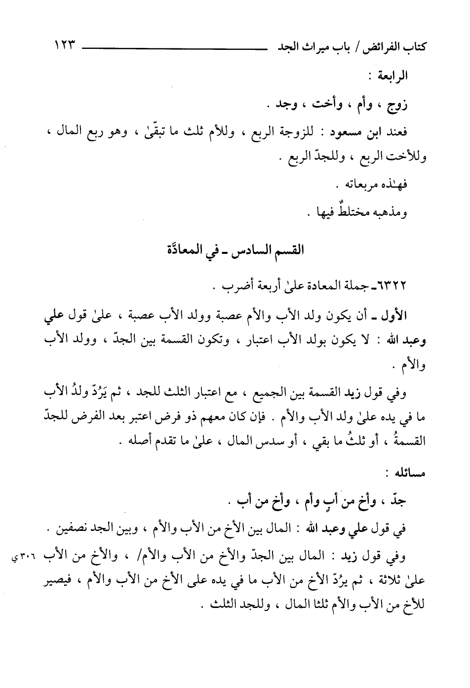 وفي قول زيد: المال بين الجدّ والأخ من الأب والأم، والأخ من الأب على ثلاثة، ثم يرُدّ الأخ من الأب ما في يده على الأخ من الأب والأم، فيصير للأخ من الأب والأم ثلثا المال، وللجد الثلث.