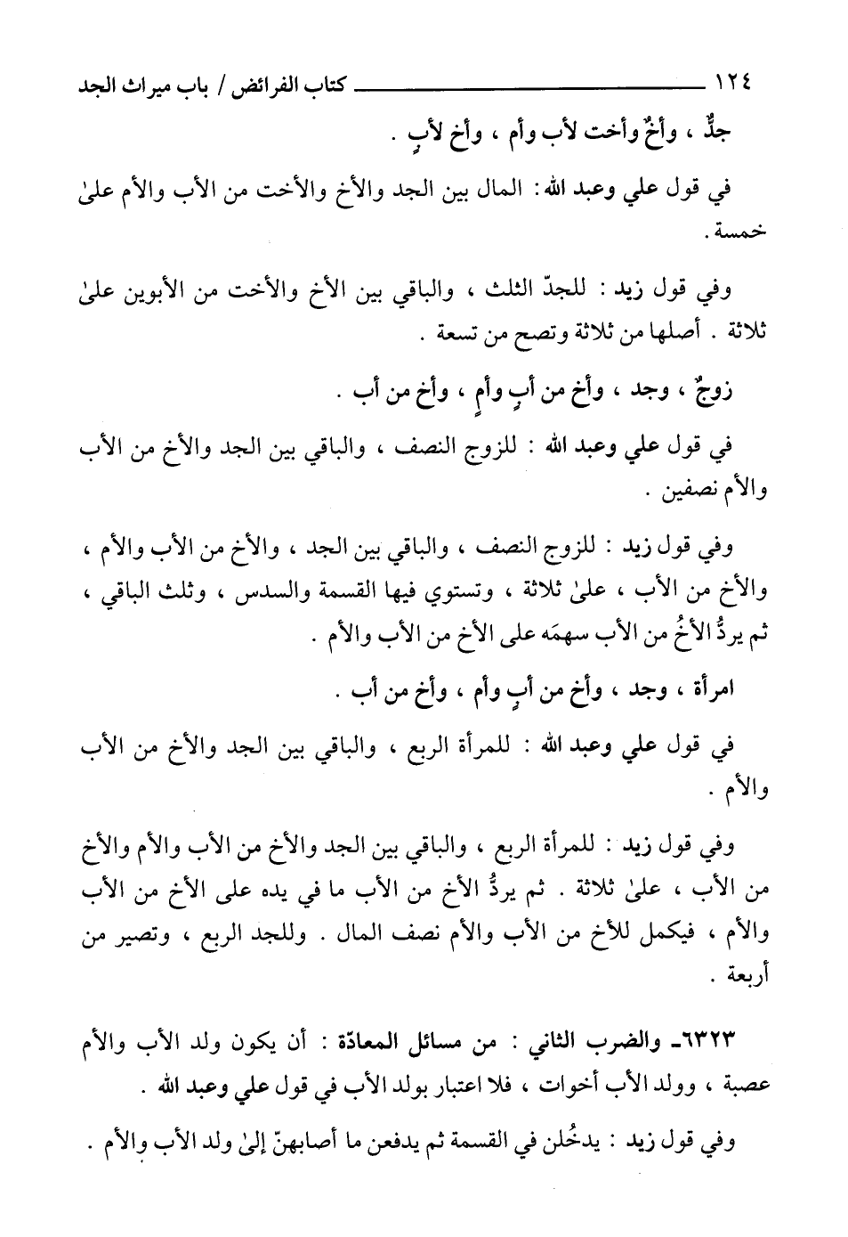 6323 - والضرب الثاني: من مسائل المعادّة: أن يكون ولد الأب والأم عصبة، وولد الأب أخوات، فلا اعتبار بولد الأب في قول علي وعبد الله.