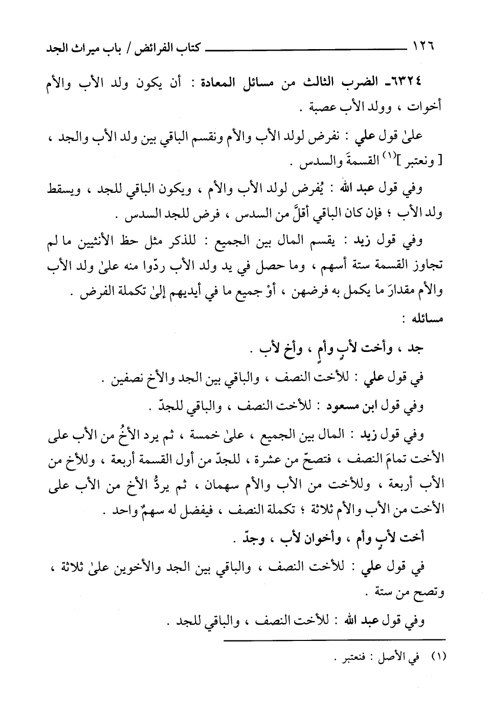 على قول علي: نفرض لولد الأب والأم ونقسم الباقي بين ولد الأب والجد، [ونعتبر] (1) القسمةَ والسدس.