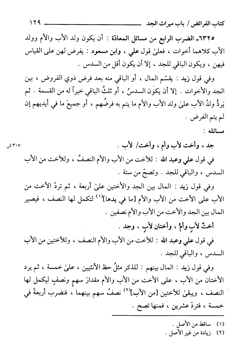 6325 - الضرب الرابع من مسائل المعادّة: أن يكون ولد الأب والأم وولد الأب كلاهما أخوات، فعلى قول علي، وابن مسعود: يفرض لهن على القياس فيهن، ويكون الباقي للجد، إلا أن يكون أقل من السدس.