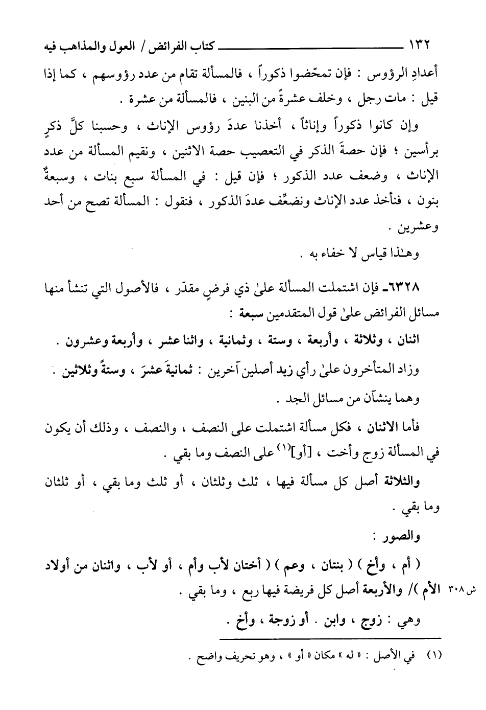 6328 - فإن اشتملت المسألة على ذي فرضٍ مقدّر، فالأصول التي تنشأ منها مسائل الفرائض على قول المتقدمين سبعة: