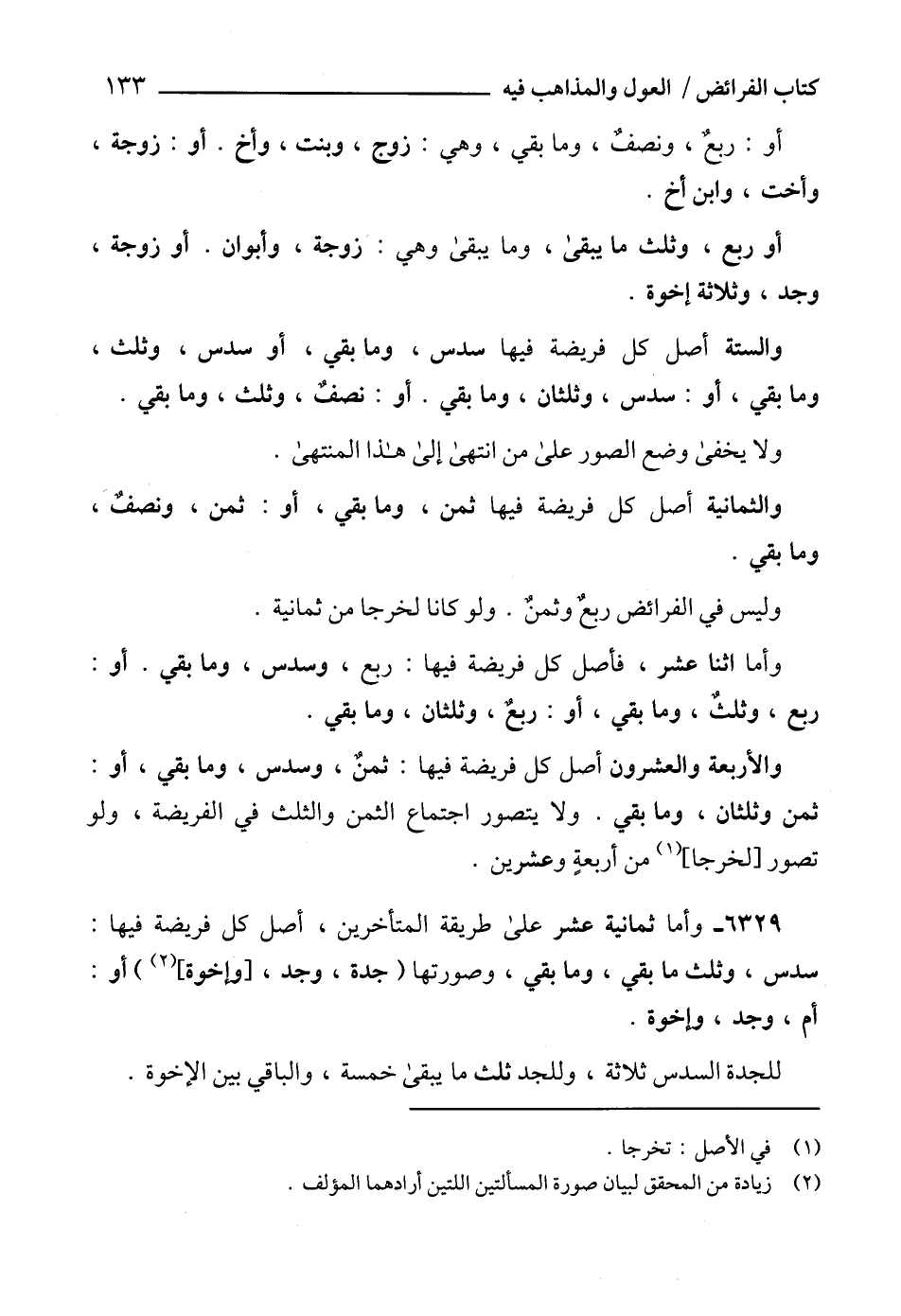 6329 - وأما ثمانية عشر على طريقة المتأخرين، أصل كل فريضة فيها: سدس، وثلث ما بقي، وما بقي، وصورتها (جدة، وجد، [وإخوة] (2)) أو: أم، وجد، وإخوة.
