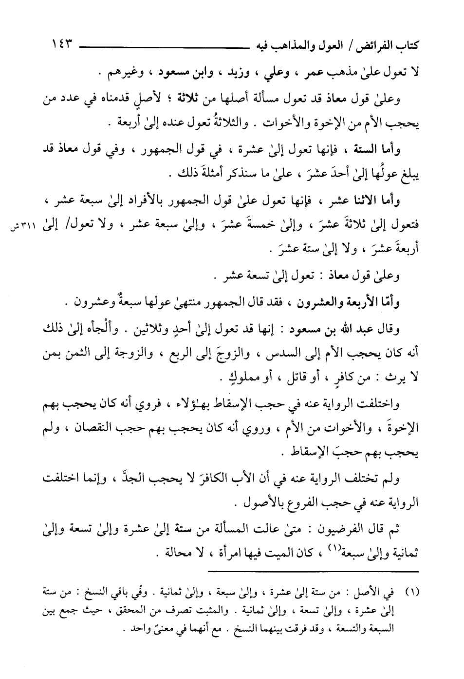 وعلى قول معاذ قد تعول مسألة أصلها من ثلاثة؛ لأصلٍ قدمناه في عدد من يحجب الأم من الإخوة والأخوات. والثلاثةُ تعول عنده إلى أربعة.