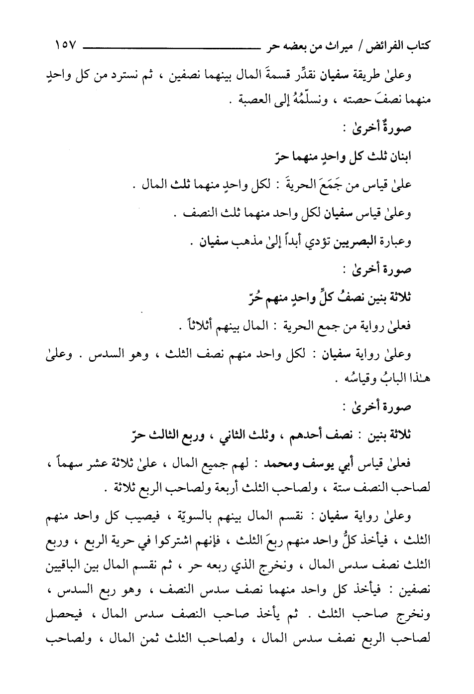 وعلى رواية سفيان: نقسم المال بينهم بالسويّة، فيصيب كل واحد منهم الثلث، فيأخذ كلُّ واحد منهم ربعَ الثلث، فإنهم اشتركوا في حرية الربع، وربع الثلث نصف سدس المال، ونخرج الذي ربعه حر، ثم نقسم المال بين الباقيين نصفين: فيأخذ كل واحد منهما نصف سدس النصف، وهو ربع السدس، ونخرج صاحب الثلث. ثم يأخذ صاحب النصف سدس المال، فيحصل لصاحب الربع نصف سدس المال، ولصاحب الثلث ثمن المال، ولصاحب