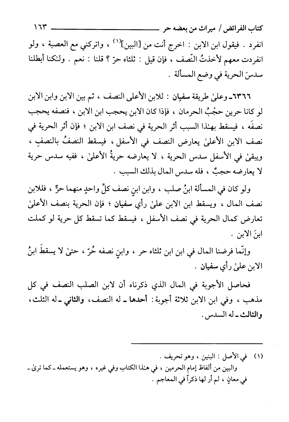 6366 - وعلى طريقة سفيان: للابن الأعلى النصف، ثم بين الابن وابن الابن لو كانا حرين حجْبُ الحرمان، فإذا كان الابن يحجب ابن الابن، فنصفه يحجب نصفَه، فيسقط بهذا السبب أثر الحرية في نصف ابن الابن؛ فإن أثر الحرية في نصف الابن الأعلى يعارض النصف في الأسفل، فيسقط النصفُ بالنصفِ، ويبقى في الأسفل سدس الحرية، لا يعارضه حريةُ الأعلى، ففيه سدس حرية لا يعارضه حجبٌ، فله سدس المال بذلك السبب.