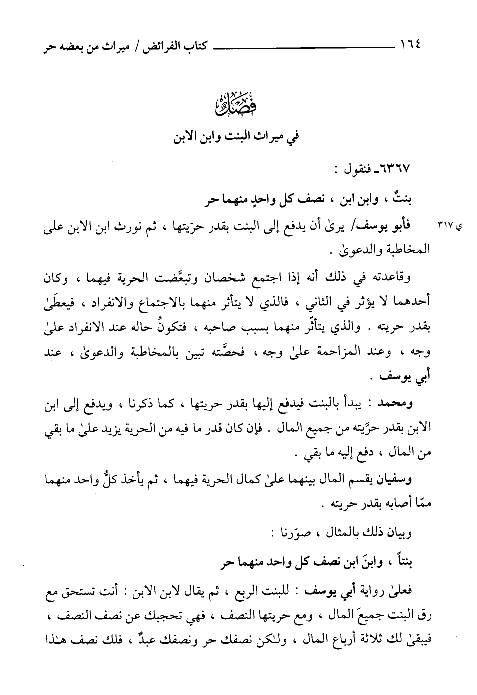 فأبو يوسف يرى أن يدفع إلى البنت بقدر حرّيتها، ثم نورث ابن الابن على المخاطبة والدعوى.