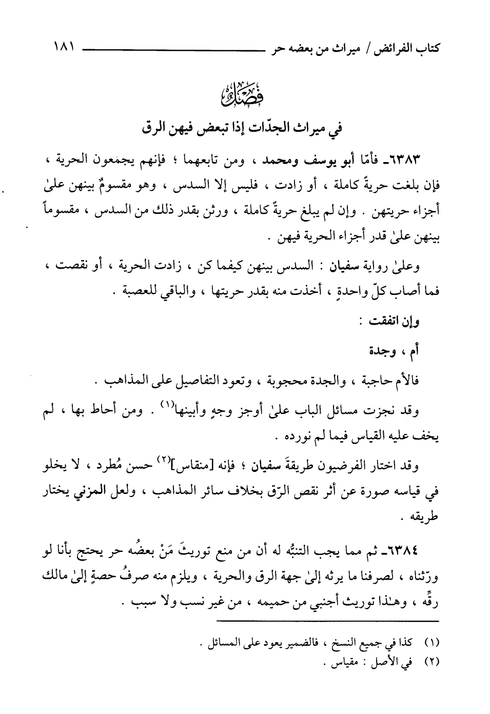 6383 - فأمّا أبو يوسف ومحمد، ومن تابعهما؛ فإنهم يجمعون الحرية، فإن بلغت حريةً كاملة، أو زادت، فليس إلا السدس، وهو مقسومٌ بينهن على أجزاء حريتهن. وإن لم يبلغ حريةً كاملة، ورثن بقدر ذلك من السدس، مقسوماً بينهن على قدر أجزاء الحرية فيهن.