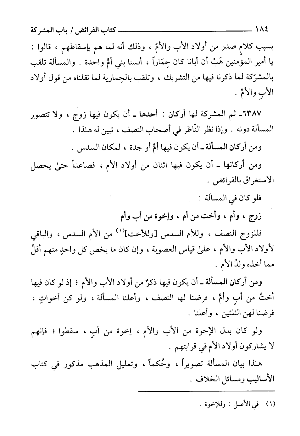 6387 - ثم المشركة لها أركان: أحدها - أن يكون فيها زوج، ولا تتصور المسألة دونه. وإذا نظر النّاظر في أصحاب النصف، تبين له هذا.