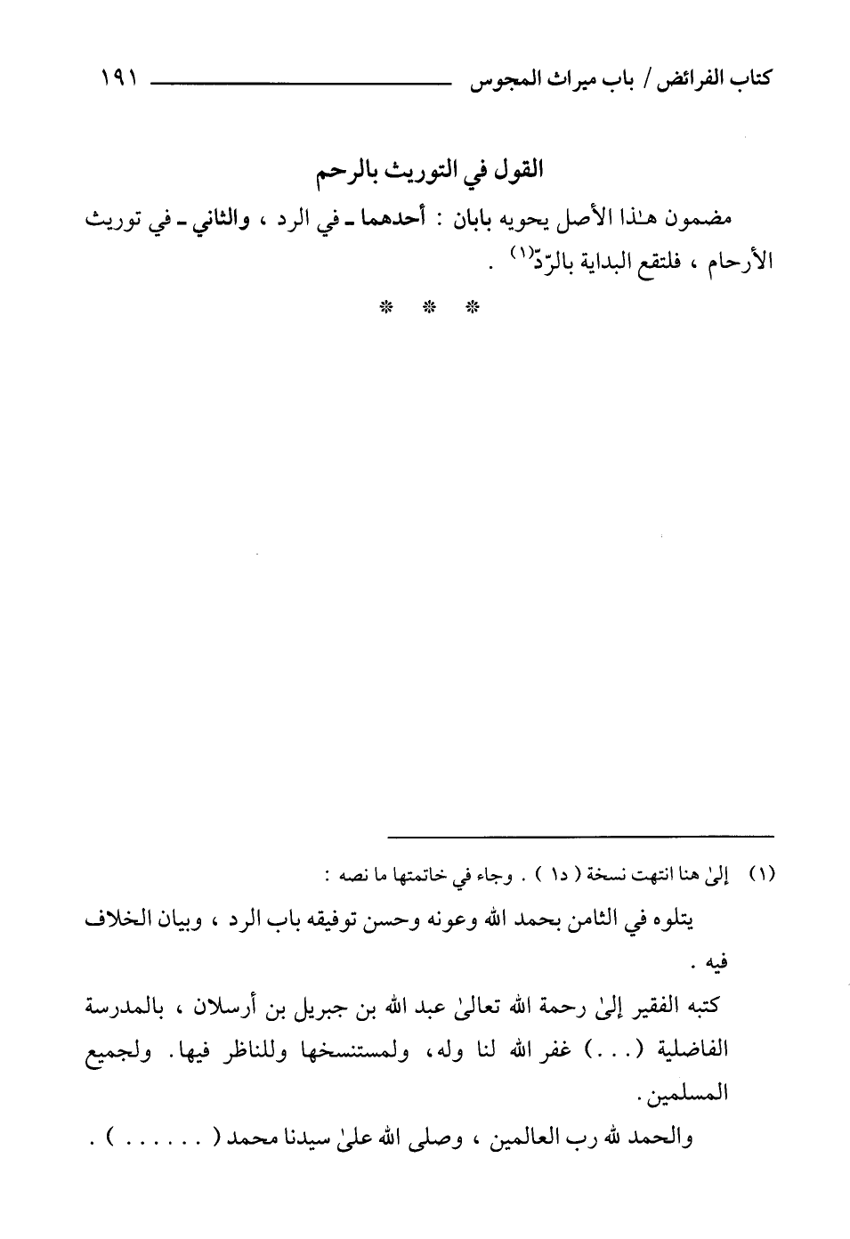 كتبه الفقير إلى رحمة الله تعالى عبد الله بن جبريل بن أرسلان، بالمدرسة الفاضلية ( ... ) غفر الله لنا وله، ولمستنسخها وللناظر فيها. ولجميع المسلمين.