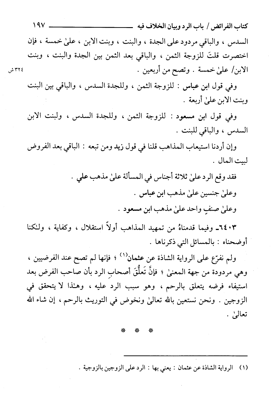 ولم نفرعّ على الرواية الشاذة عن عثمان (1)؛ فإنها لم تصح عند الفرضيين، وهي مردودة من جهة المعنى؛ فإنَّ تَعلُّقَ أصحابِ الرد بأن صاحب الفرض بعد استيفاء فرضه يتعلق بالرحم، وهو سبب الرد عليه، وهذا لا يتحقق في الزوجين. ونحن نستعين بالله تعالى ونخوض في التوريث بالرحم، إن شاء الله تعالى.