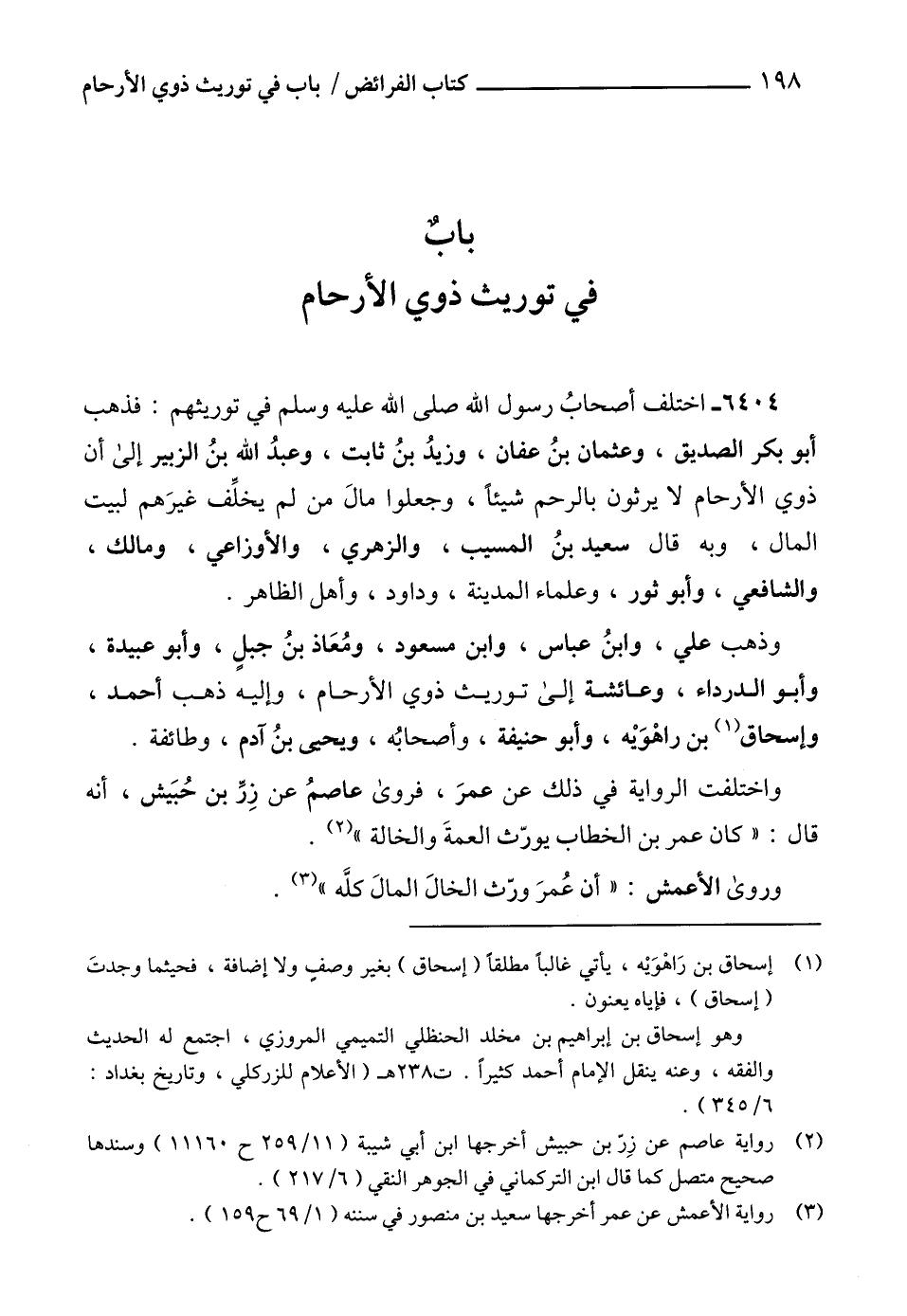 6404 - اختلف أصحابُ رسول الله صلى الله عليه وسلم في توريثهم: فذهب أبو بكر الصديق، وعثمان بنُ عفان، وزيدُ بنُ ثابت، وعبدُ الله بنُ الزبير إلى أن ذوي الأرحام لا يرثون بالرحم شيئاً، وجعلوا مالَ من لم يخلِّف غيرَهم لبيت المال، وبه قال سعيد بنُ المسيب، والزهري، والأوزاعي، ومالك، والشافعي، وأبو ثور، وعلماء المدينة، وداود، وأهل الظاهر.