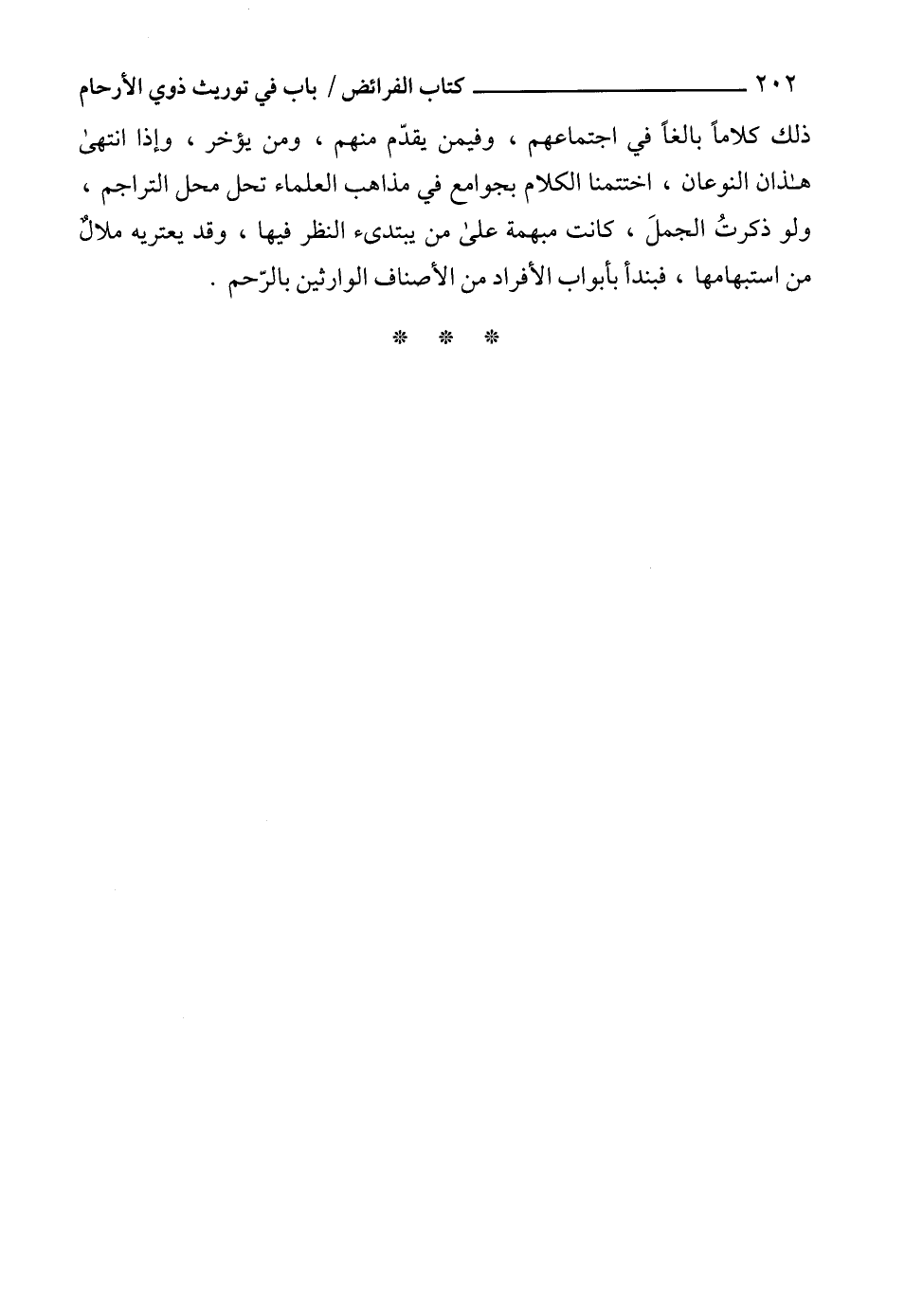ذلك كلاماً بالغاً في اجتماعهم، وفيمن يقدّم منهم، ومن يؤخر، وإذا انتهى هذان النوعان، اختتمنا الكلام بجوامع في مذاهب العلماء تحل محل التراجم، ولو ذكرتُ الجملَ، كانت مبهمة على من يبتدىء النظر فيها، وقد يعتريه ملالٌ من استبهامها، فبندأ بأبواب الأفراد من الأصناف الوارثين بالرّحم.