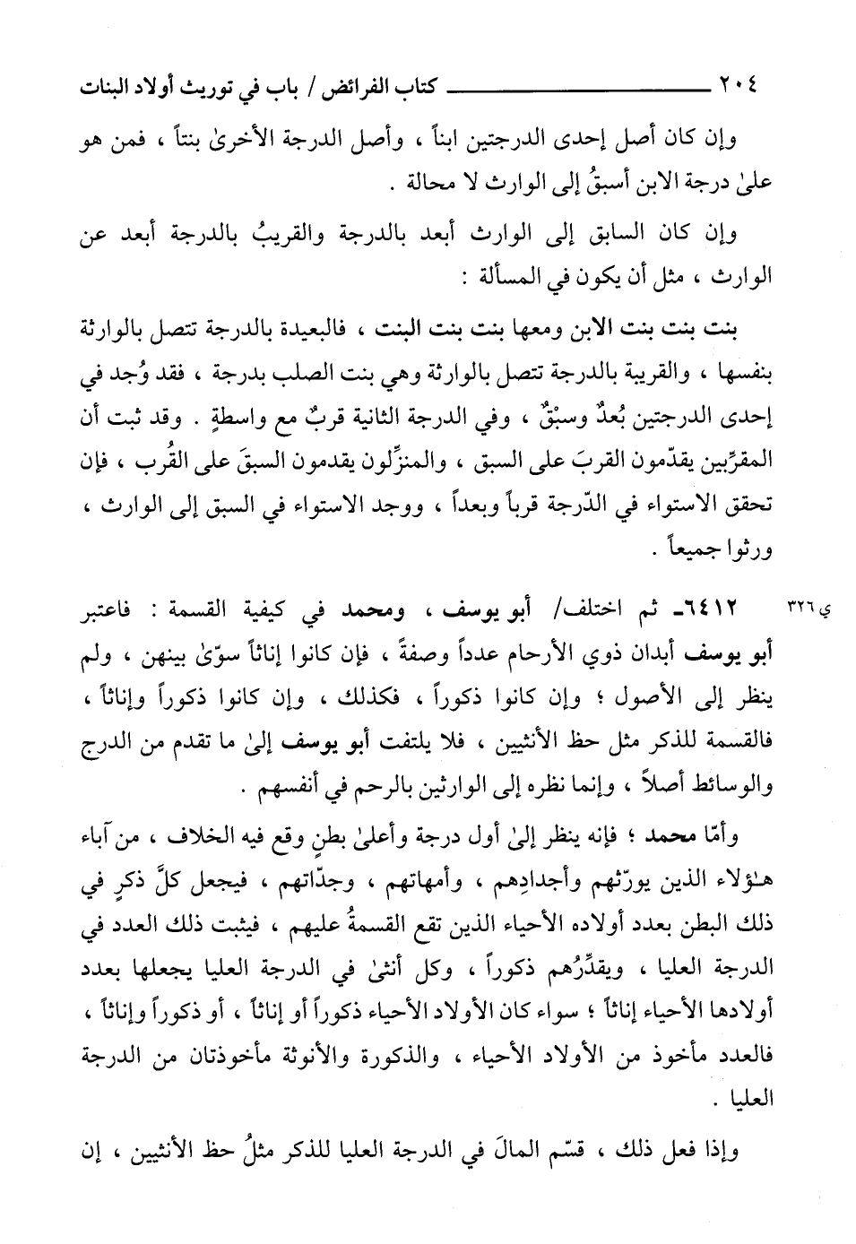 6412 - ثم اختلف أبو يوسف، ومحمد في كيفية القسمة: فاعتبر أبو يوسف أبدان ذوي الأرحام عدداً وصفةً، فإن كانوا إناثاً سوّى بينهن، ولم ينظر إلى الأصول؛ وإن كانوا ذكوراً، فكذلك، وإن كانوا ذكوراً وإناثاً، فالقسمة للذكر مثل حظ الأنثيين، فلا يلتفت أبو يوسف إلى ما تقدم من الدرج والوسائط أصلاً، وإنما نظره إلى الوارثين بالرحم في أنفسهم.