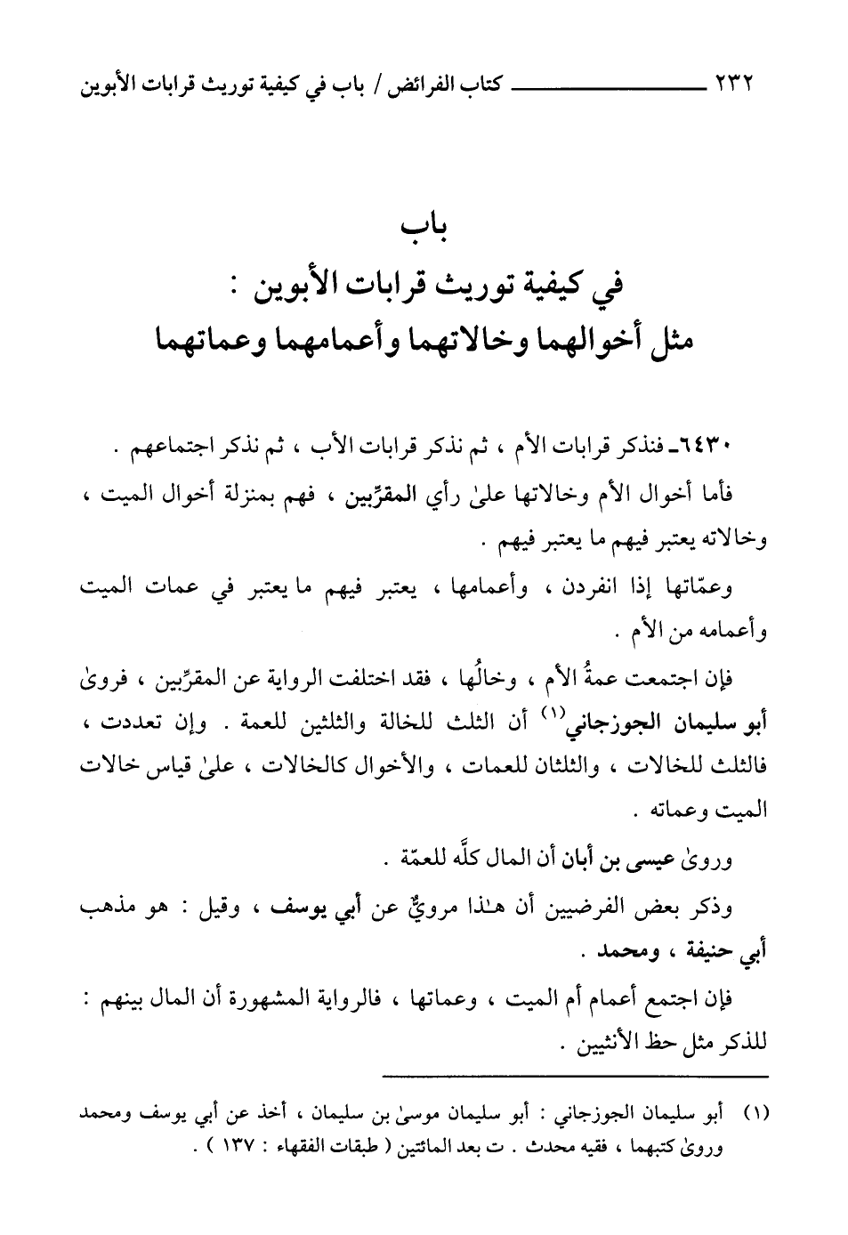 (1) أبو سليمان الجوزجاني: أبو سليمان موسى بن سليمان، أخذ عن أبي يوسف ومحمد وروى كتبهما، فقيه محدث. ت بعد المائتين (طبقات الفقهاء: 137).