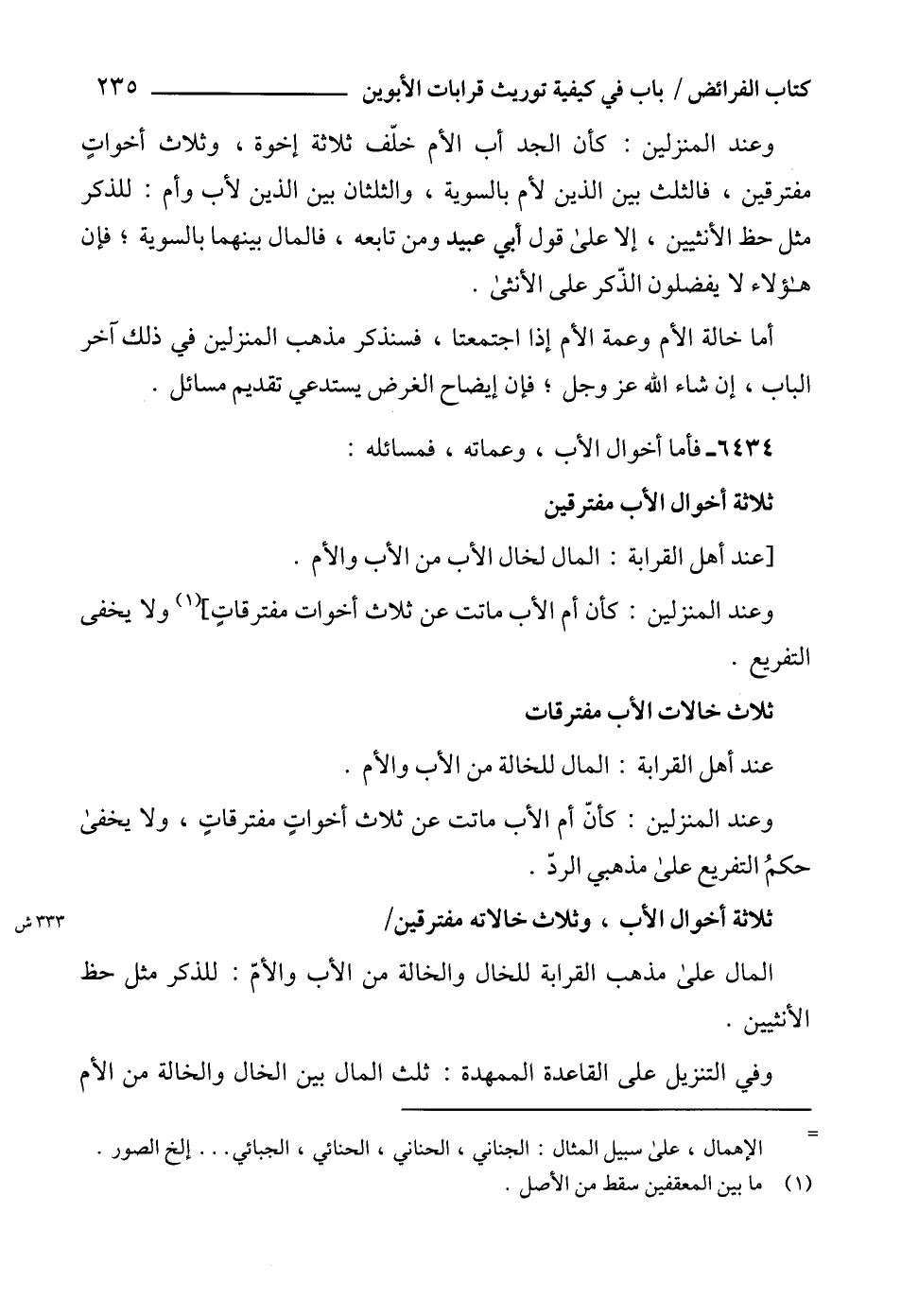 وعند المنزلين: كأن الجد أب الأم خلّف ثلاثة إخوة، وثلاث أخواتٍ مفترقين، فالثلث بين الذين لأم بالسوية، والثلثان بين الذين لأب وأم: للذكر مثل حظ الأنثيين، إلا على قول أبي عبيد ومن تابعه، فالمال بينهما بالسوية؛ فإن هؤلاء لا يفضلون الذّكر على الأنثى.