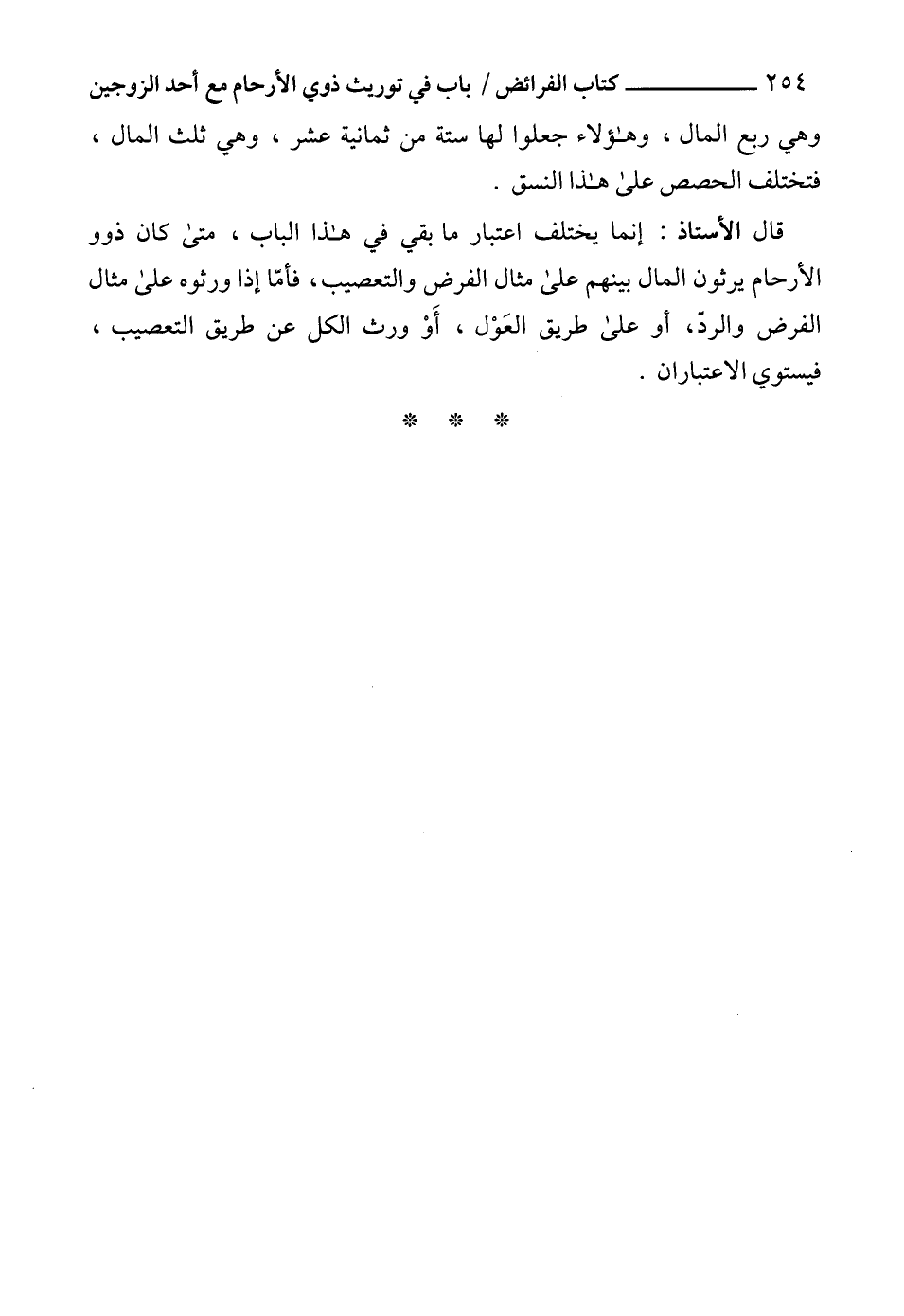 قال الأستاذ: إنما يختلف اعتبار ما بقي في هذا الباب، متى كان ذوو الأرحام يرثون المال بينهم على مثال الفرض والتعصيب، فأمّا إذا ورثوه على مثال الفرض والردّ، أو على طريق العَوْل، أَوْ ورث الكل عن طريق التعصيب، فيستوي الاعتباران.