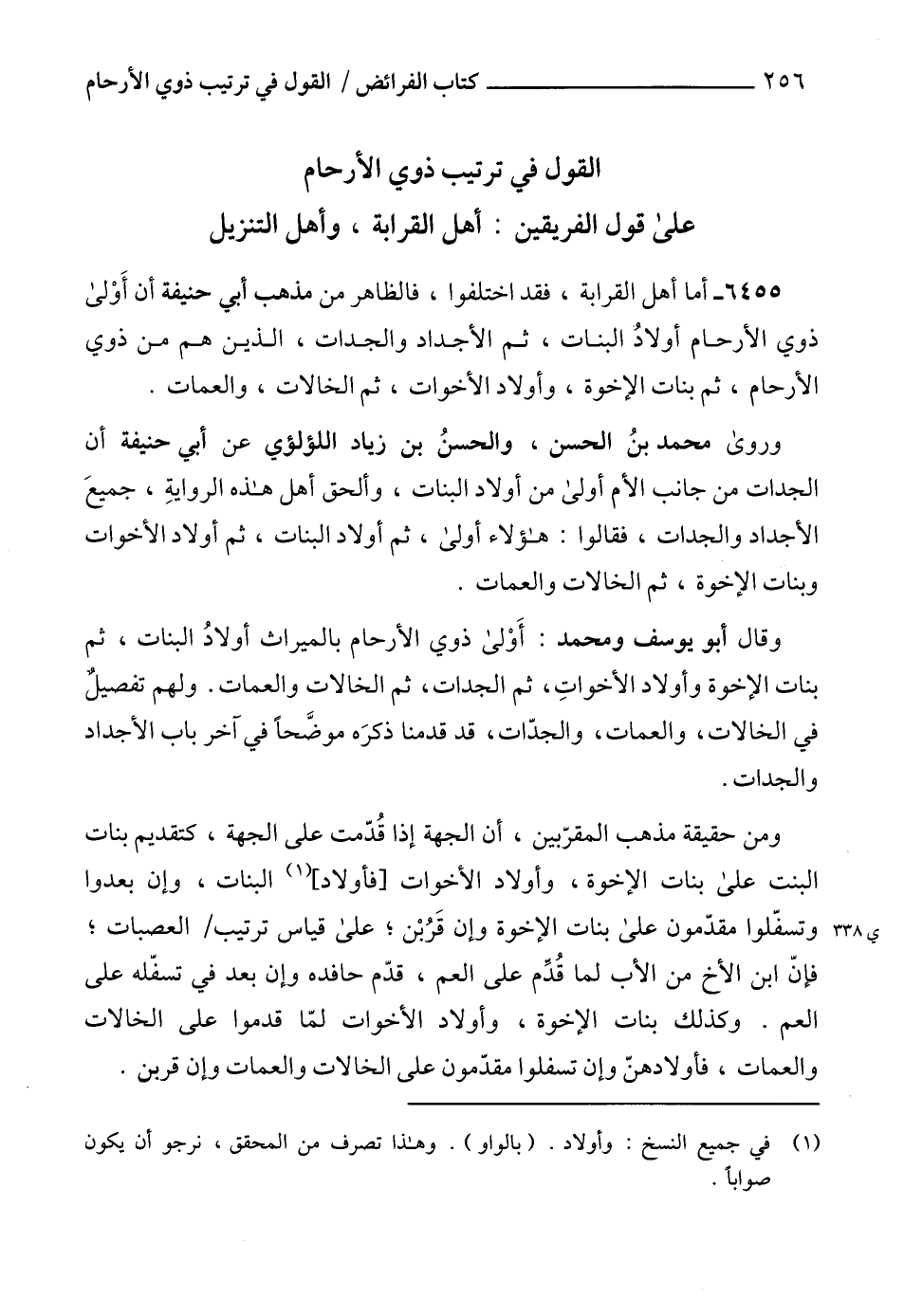 6455 - أما أهل القرابة، فقد اختلفوا، فالظاهر من مذهب أبي حنيفة أن أَوْلى ذوي الأرحام أولادُ البنات، ثم الأجداد والجدات، الذين هم من ذوي الأرحام، ثم بنات الإخوة، وأولاد الأخوات، ثم الخالات، والعمات.